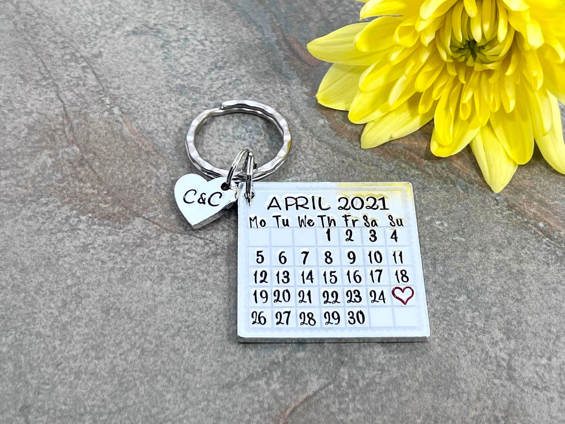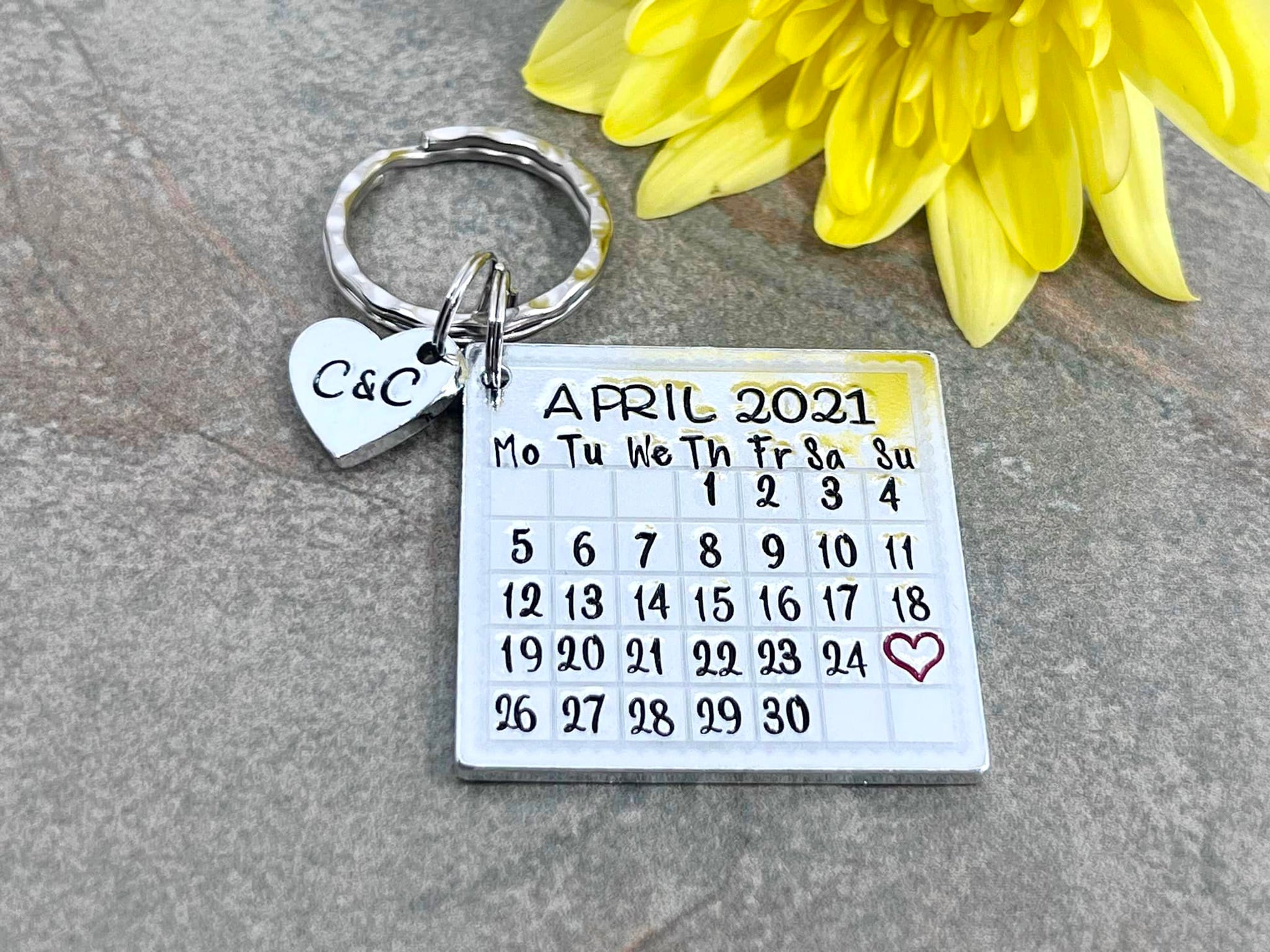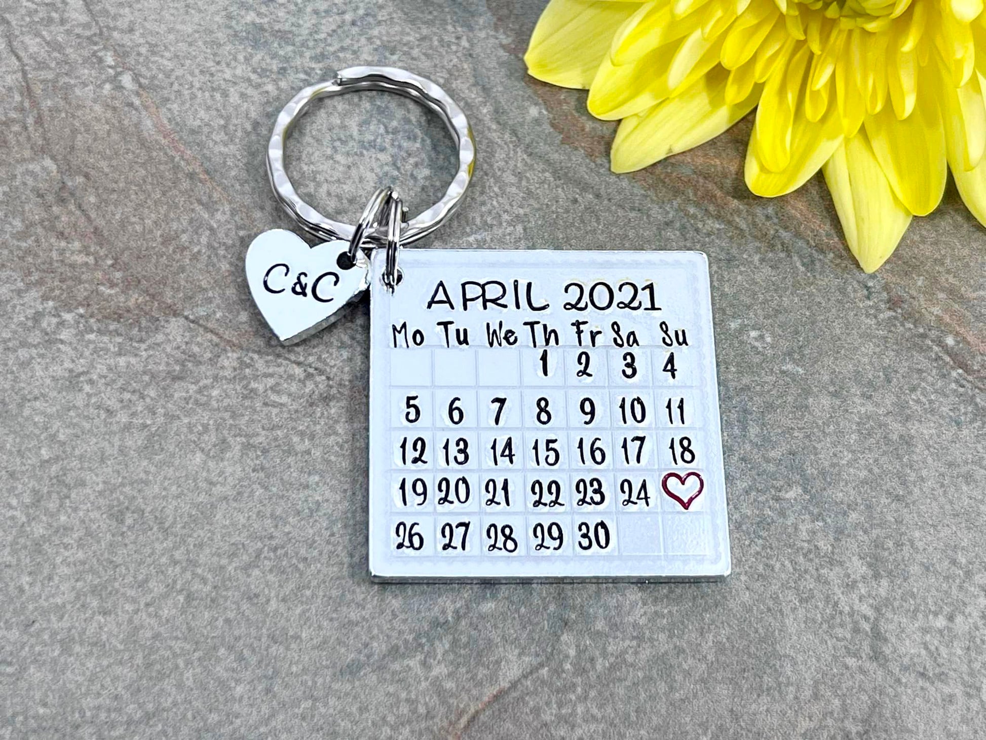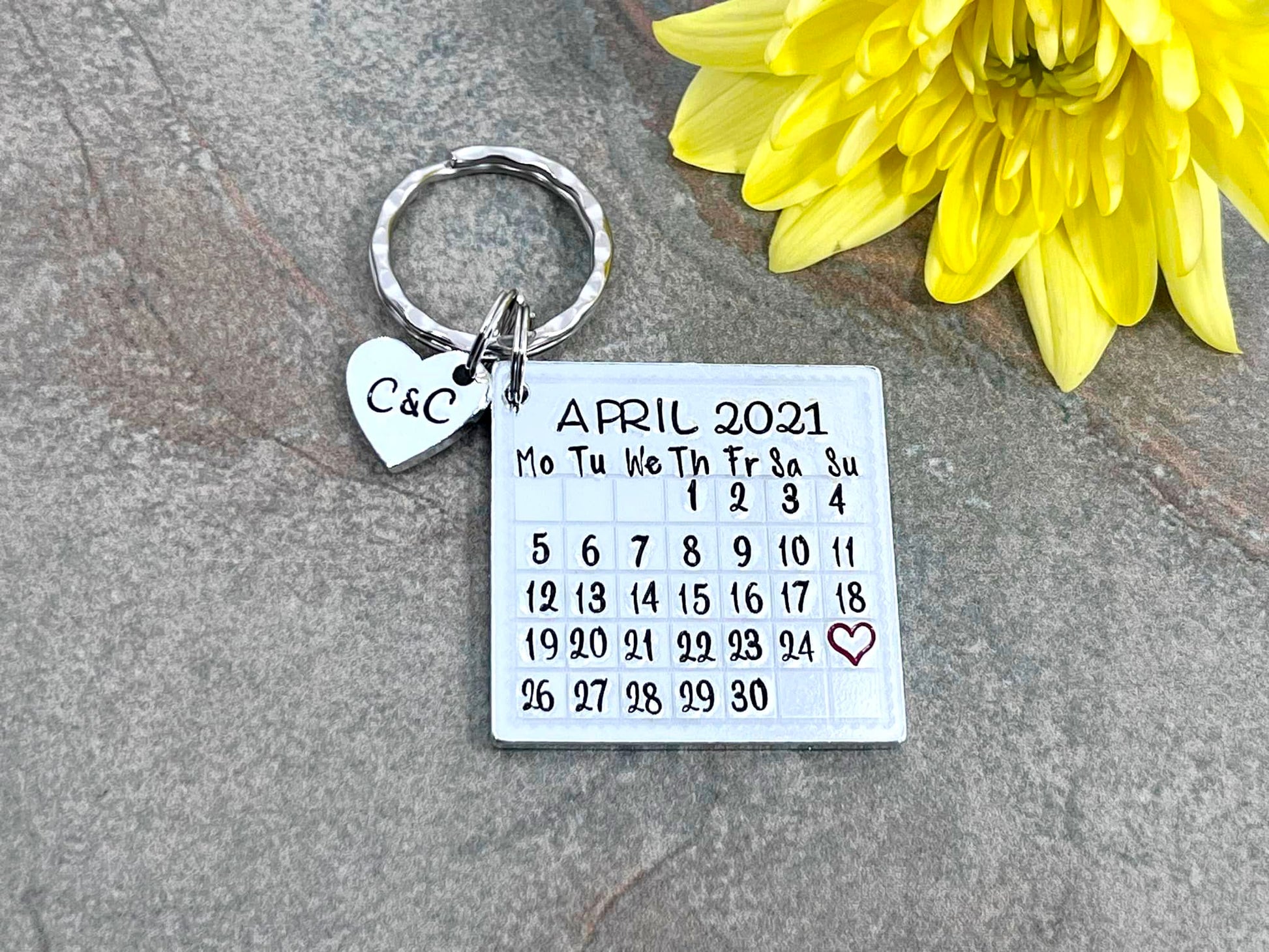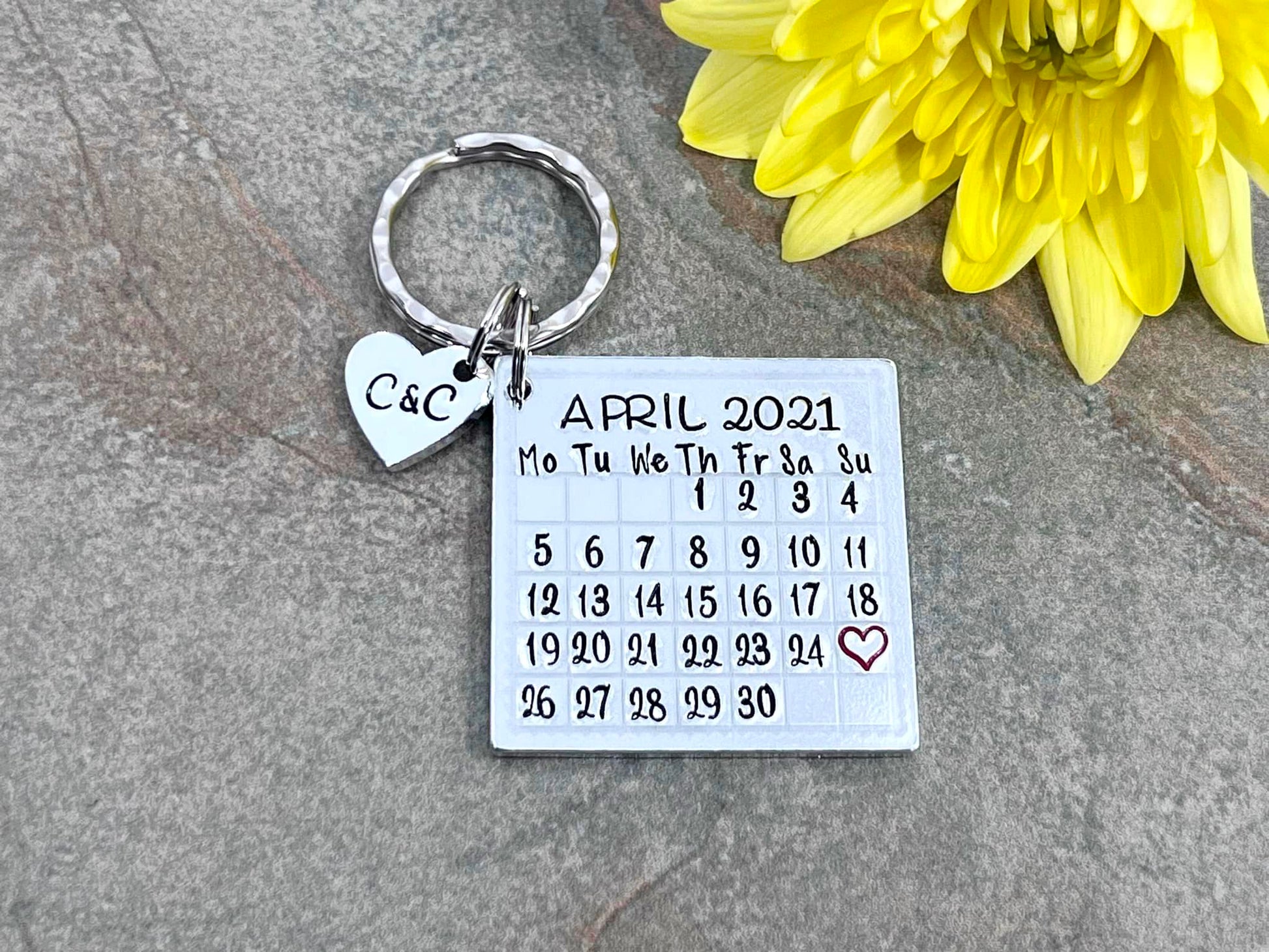 Hand stamped personalised calendar keyring.