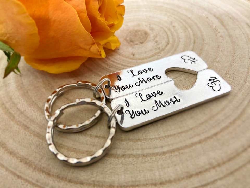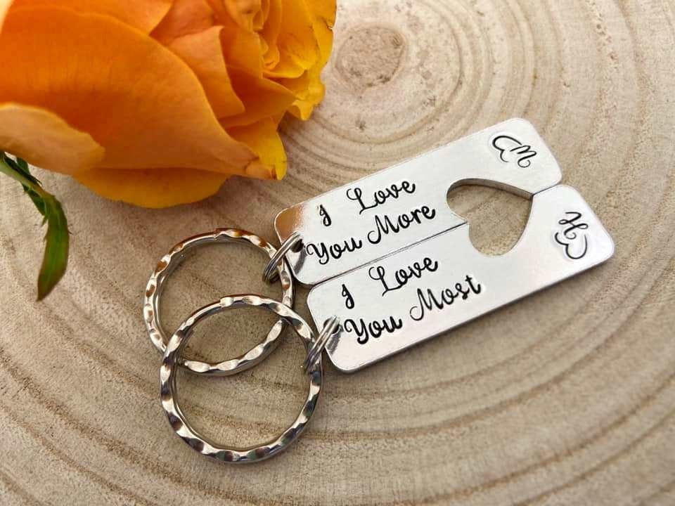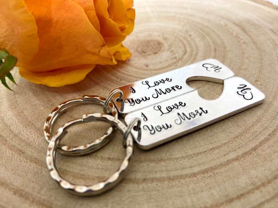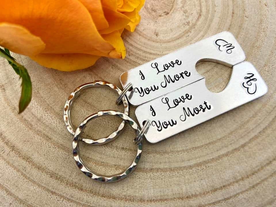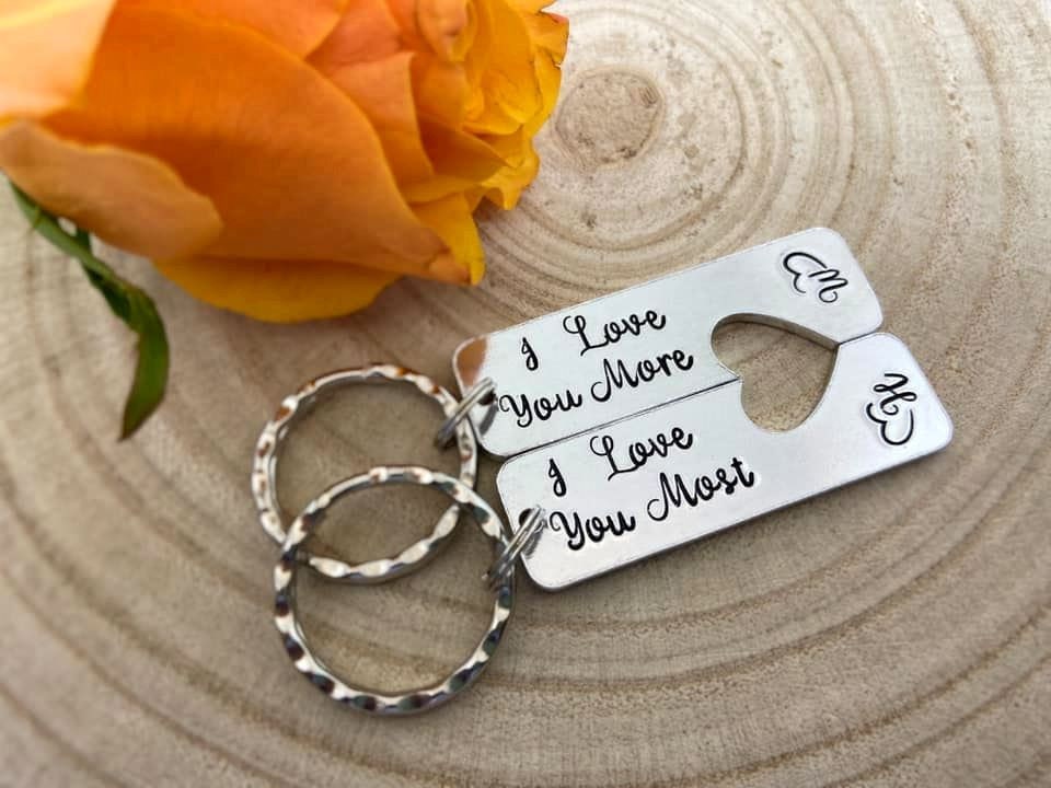 Hand stamped set of 2 keyrings. I love you more - I love you most. This set features initials chosen by you with a heart on each.