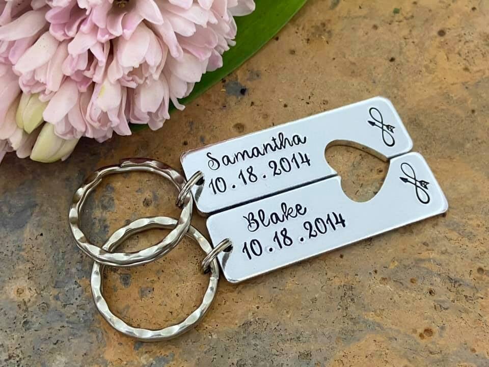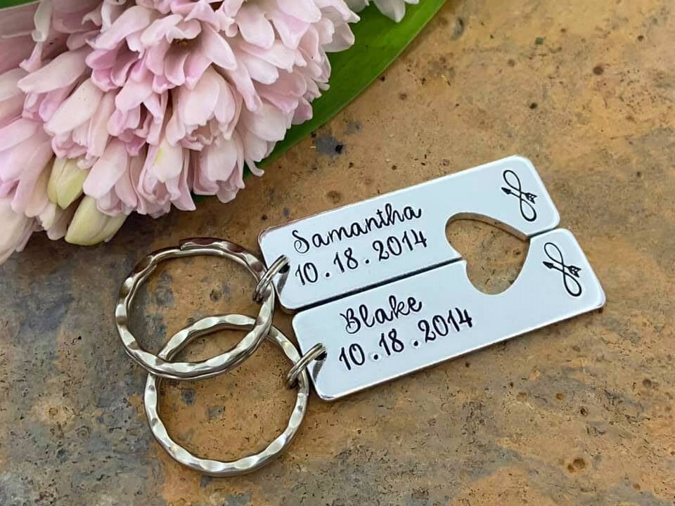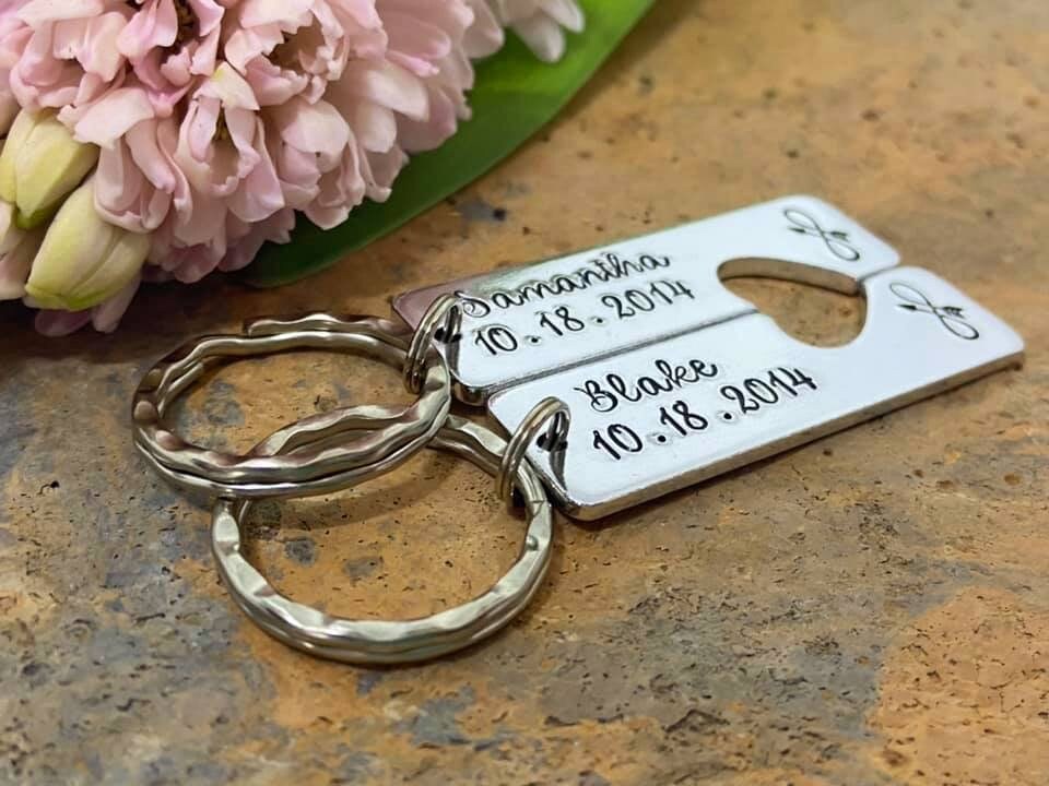 Stamped by hand set of 2 keyrings. This set features a date and names chosen by you.