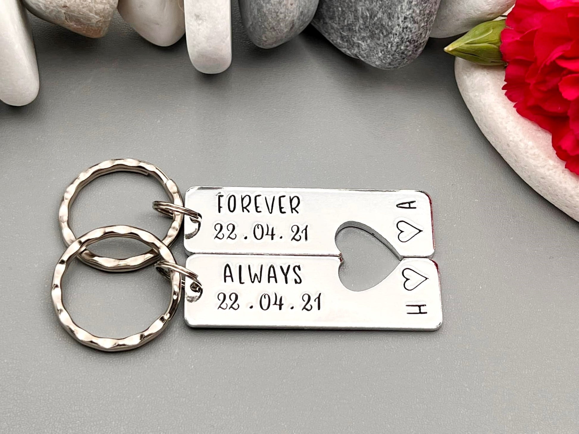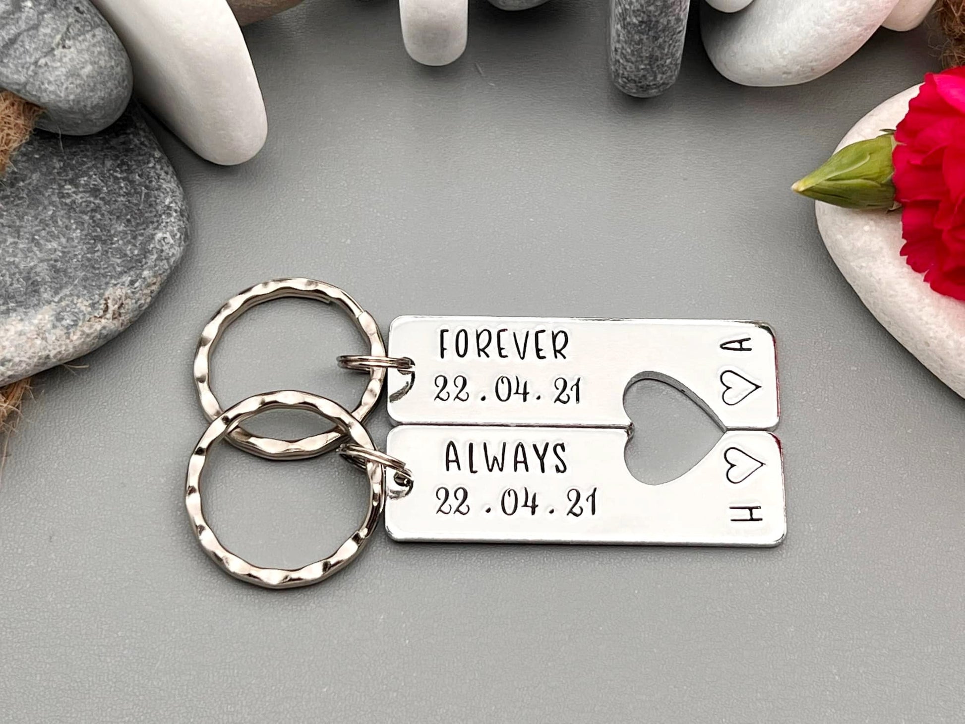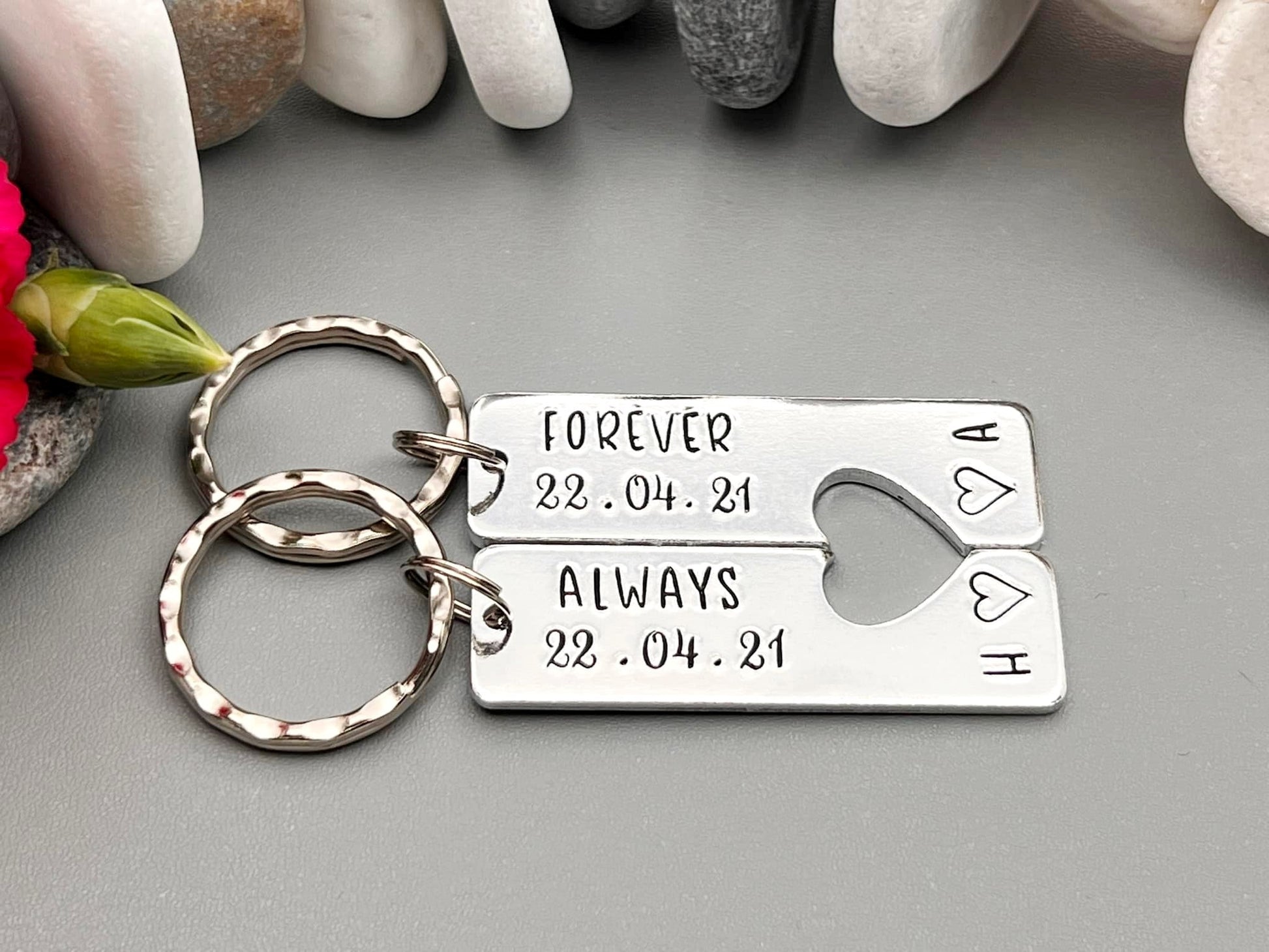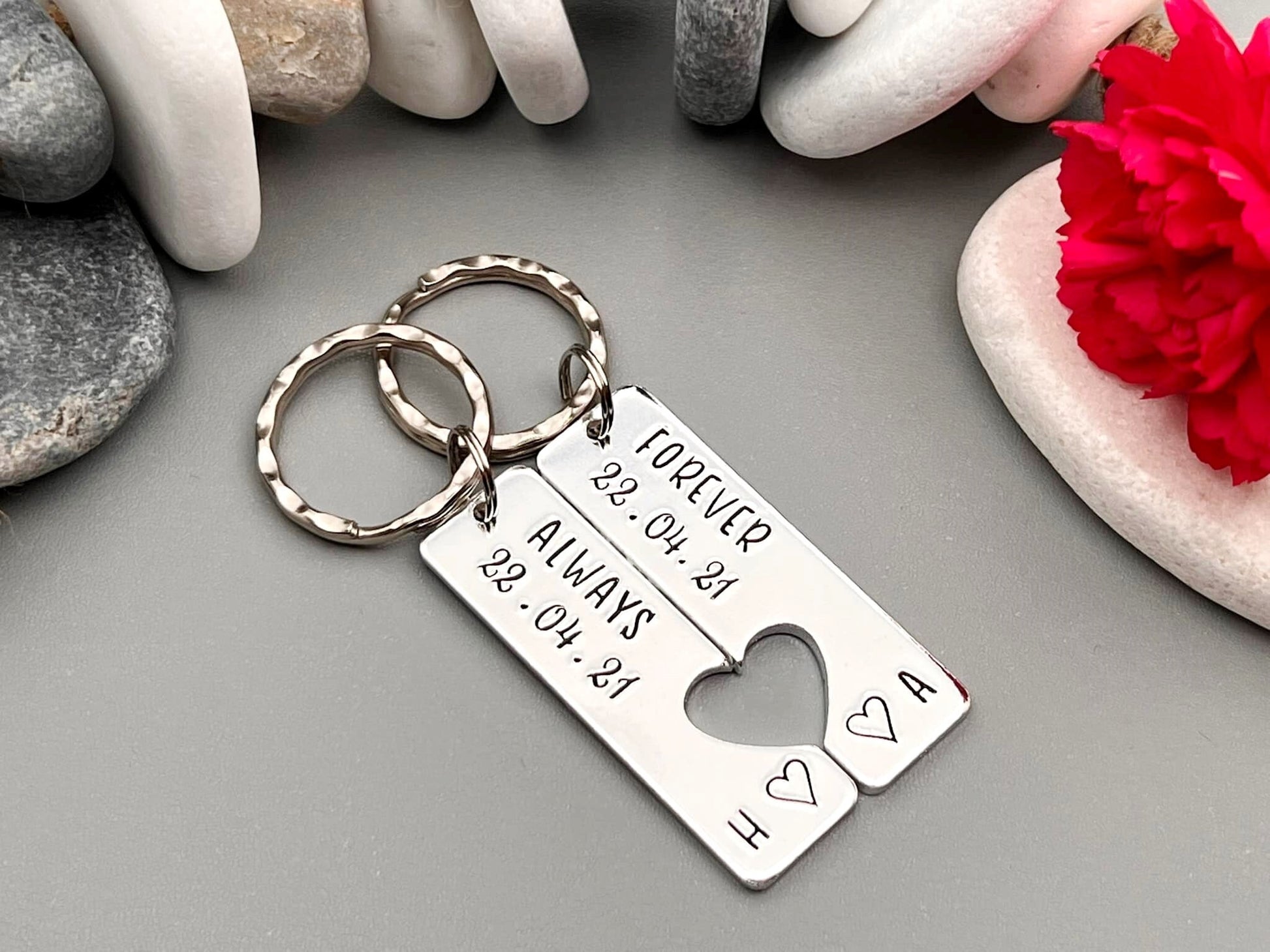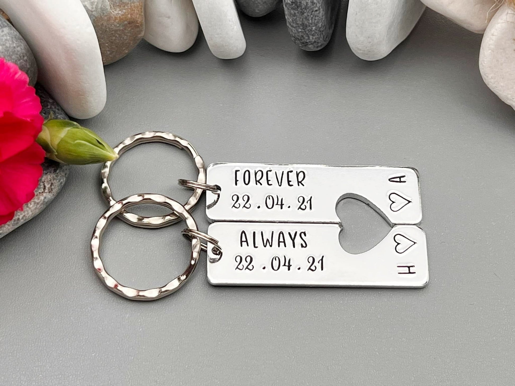 Hand stamped set of 2 matching keyrings. This set features your special date and initials with a heart on each.