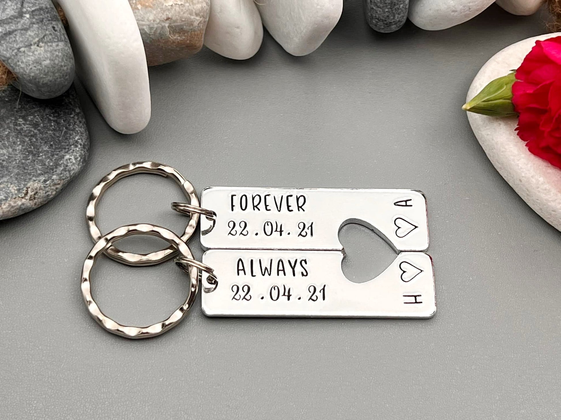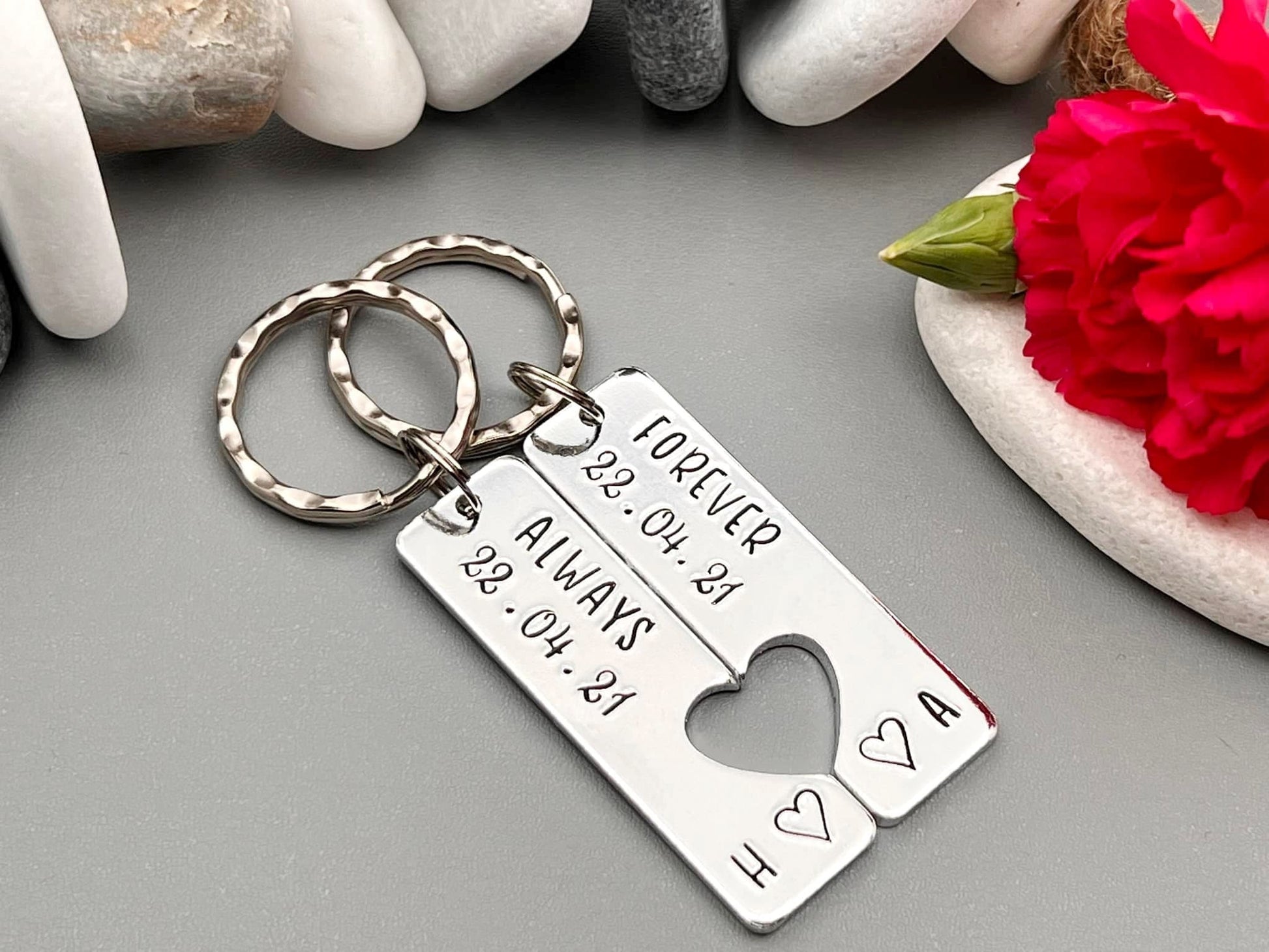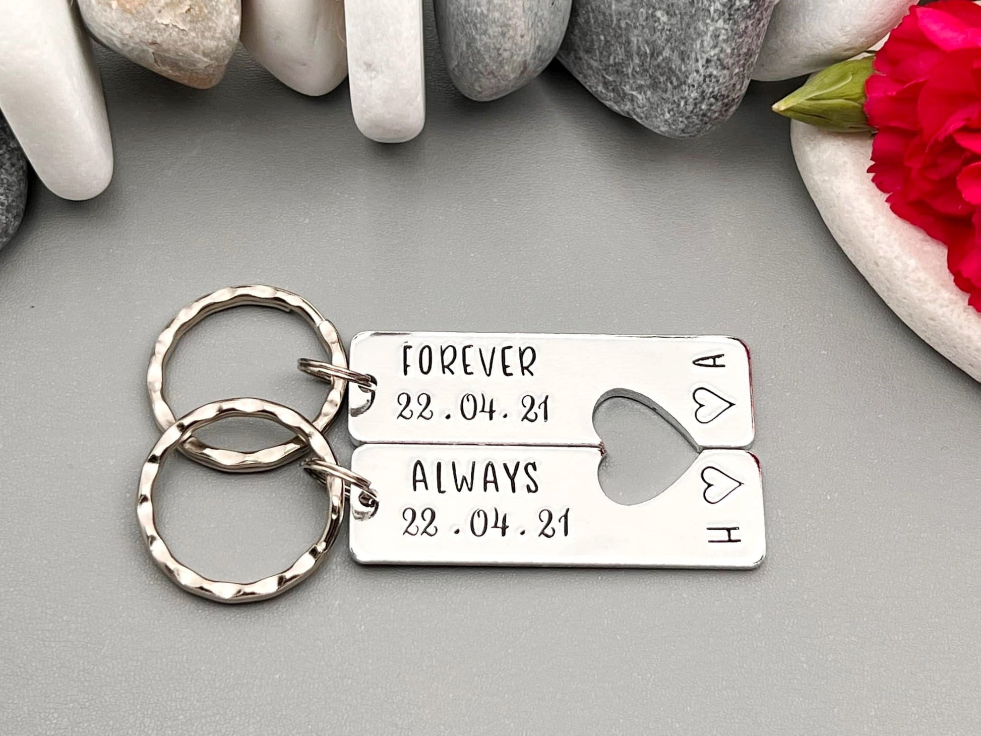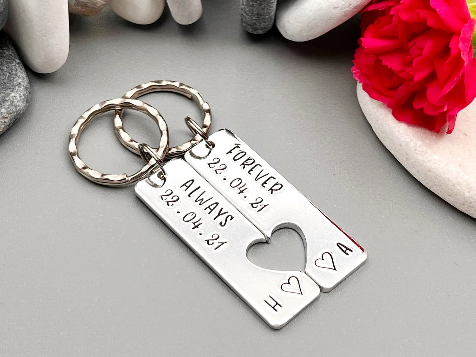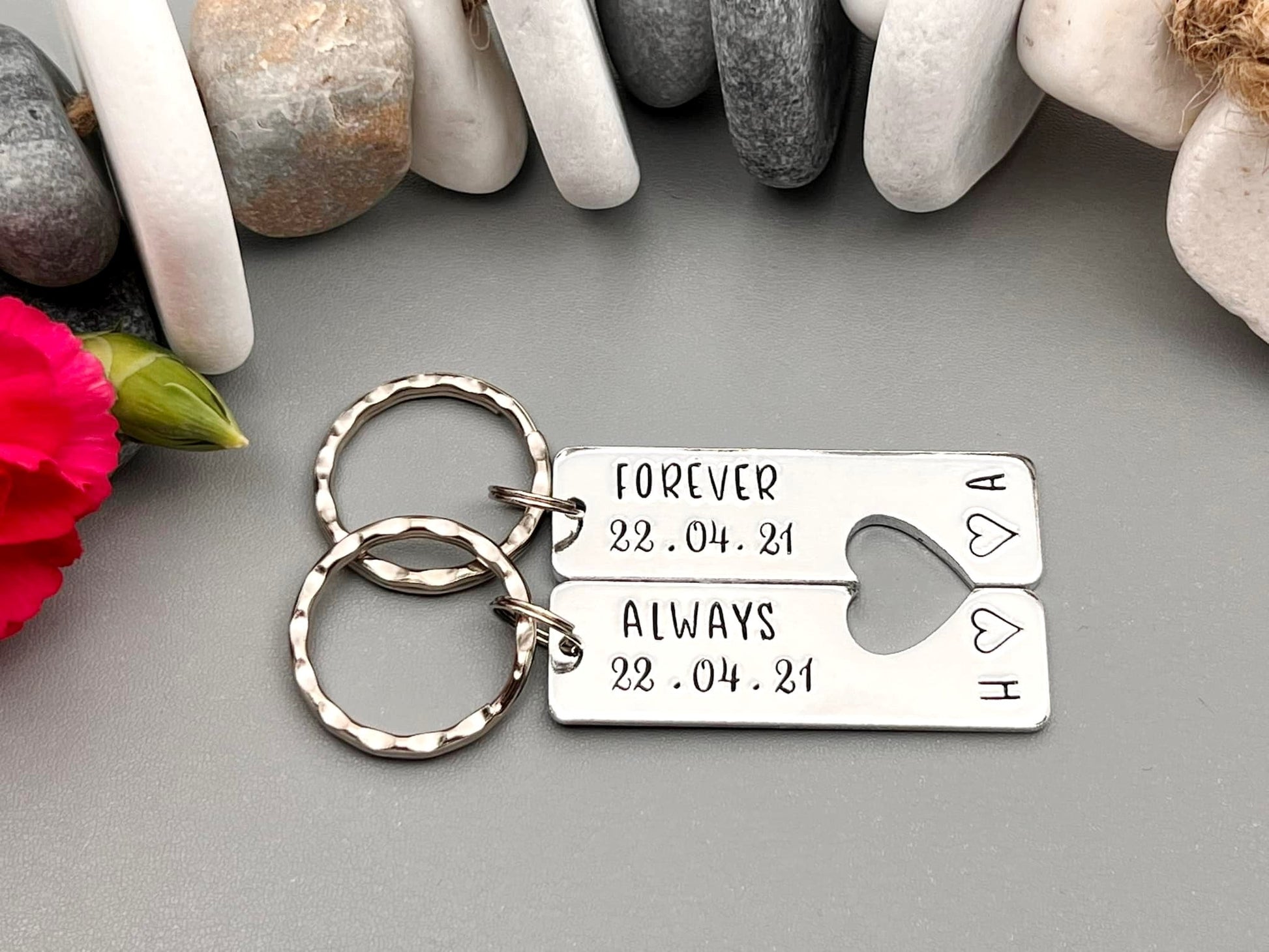 Hand stamped set of 2 matching keyrings. This set features your special date and initials with a heart on each.