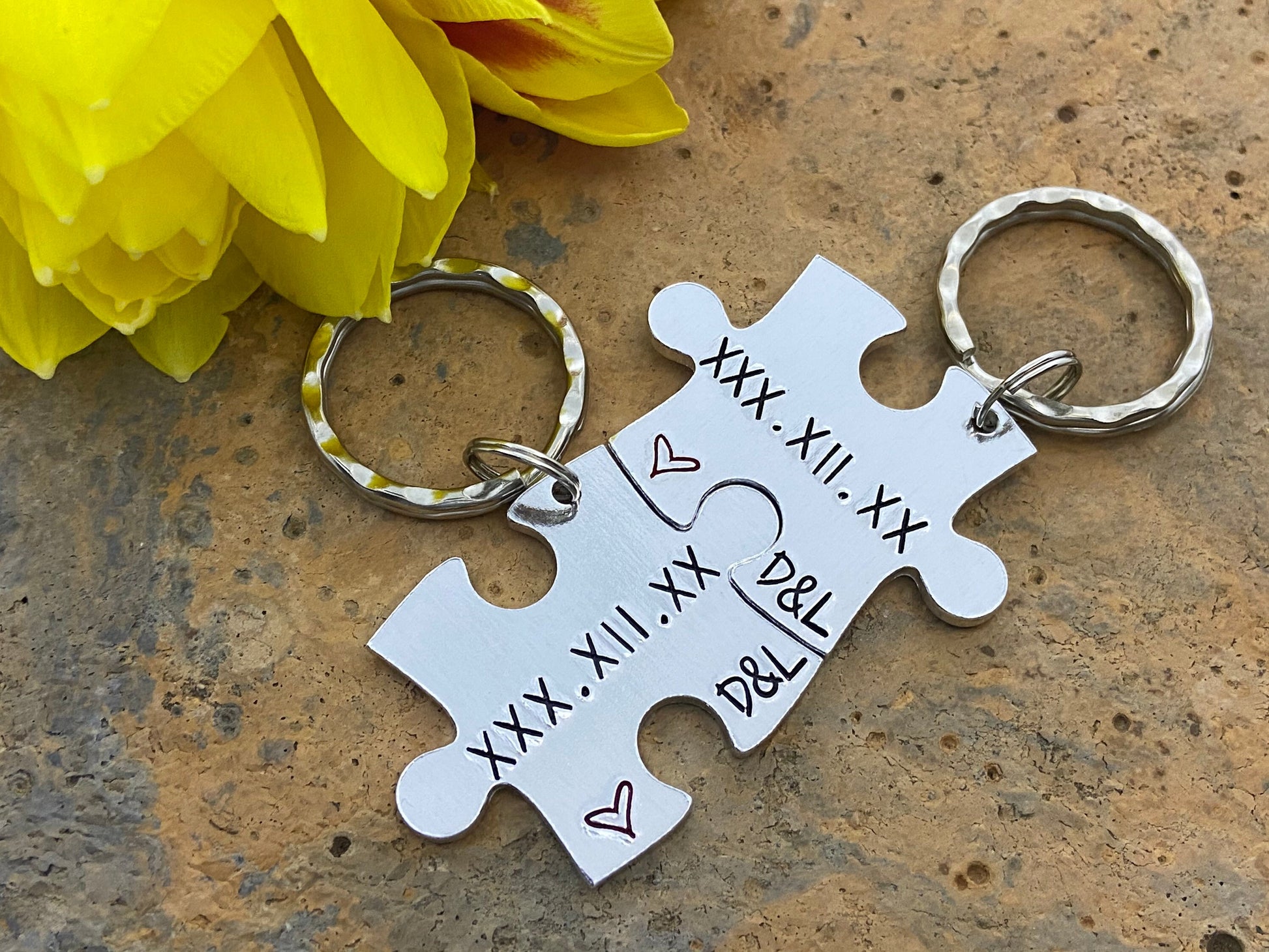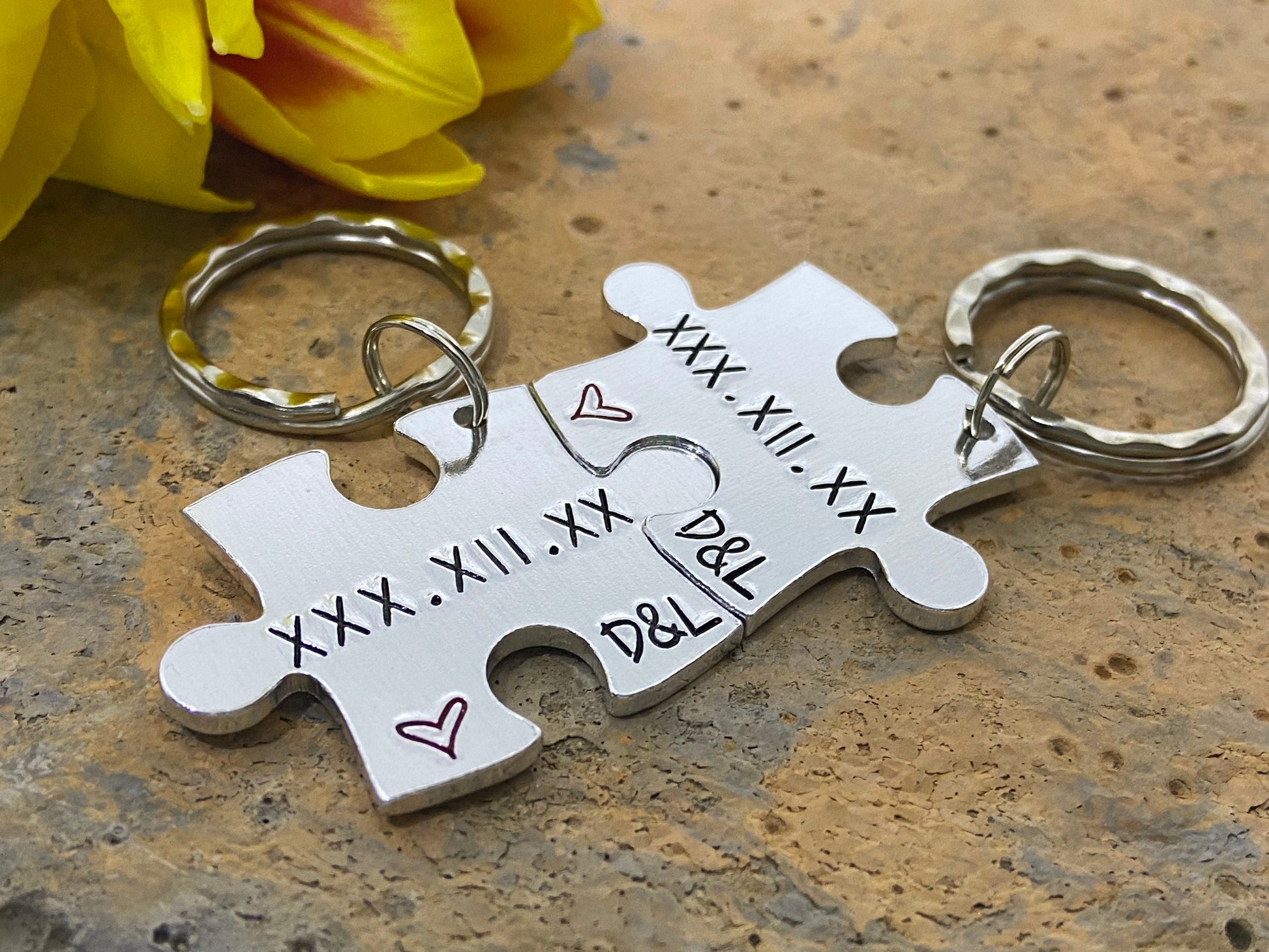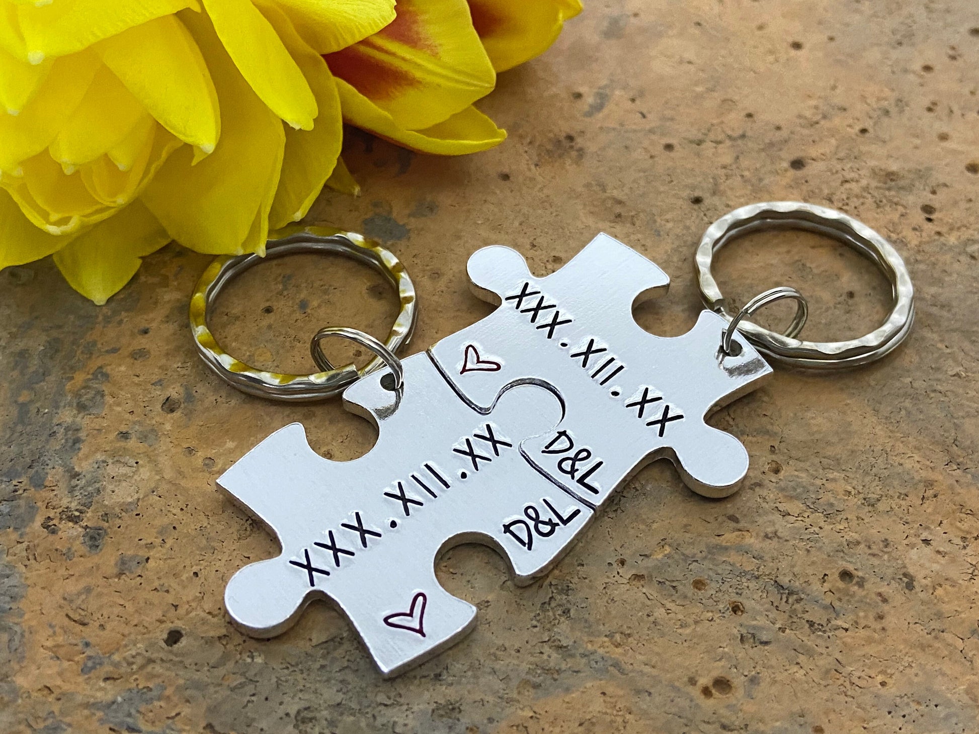 Personalised interlocking set of 2 puzzle keyrings. These hand crafted keyrings make an ideal anniversary, wedding or Valentine's gift.