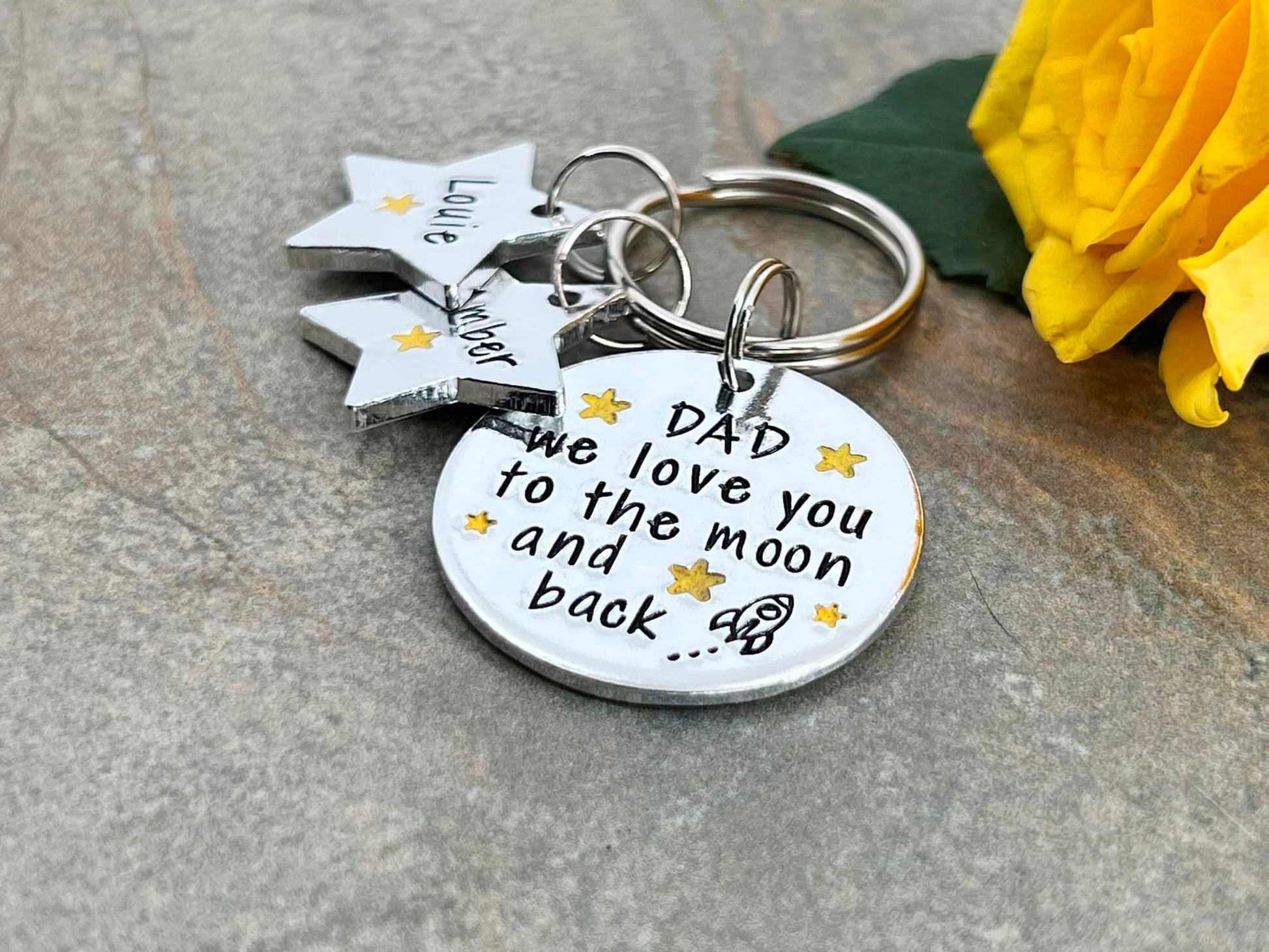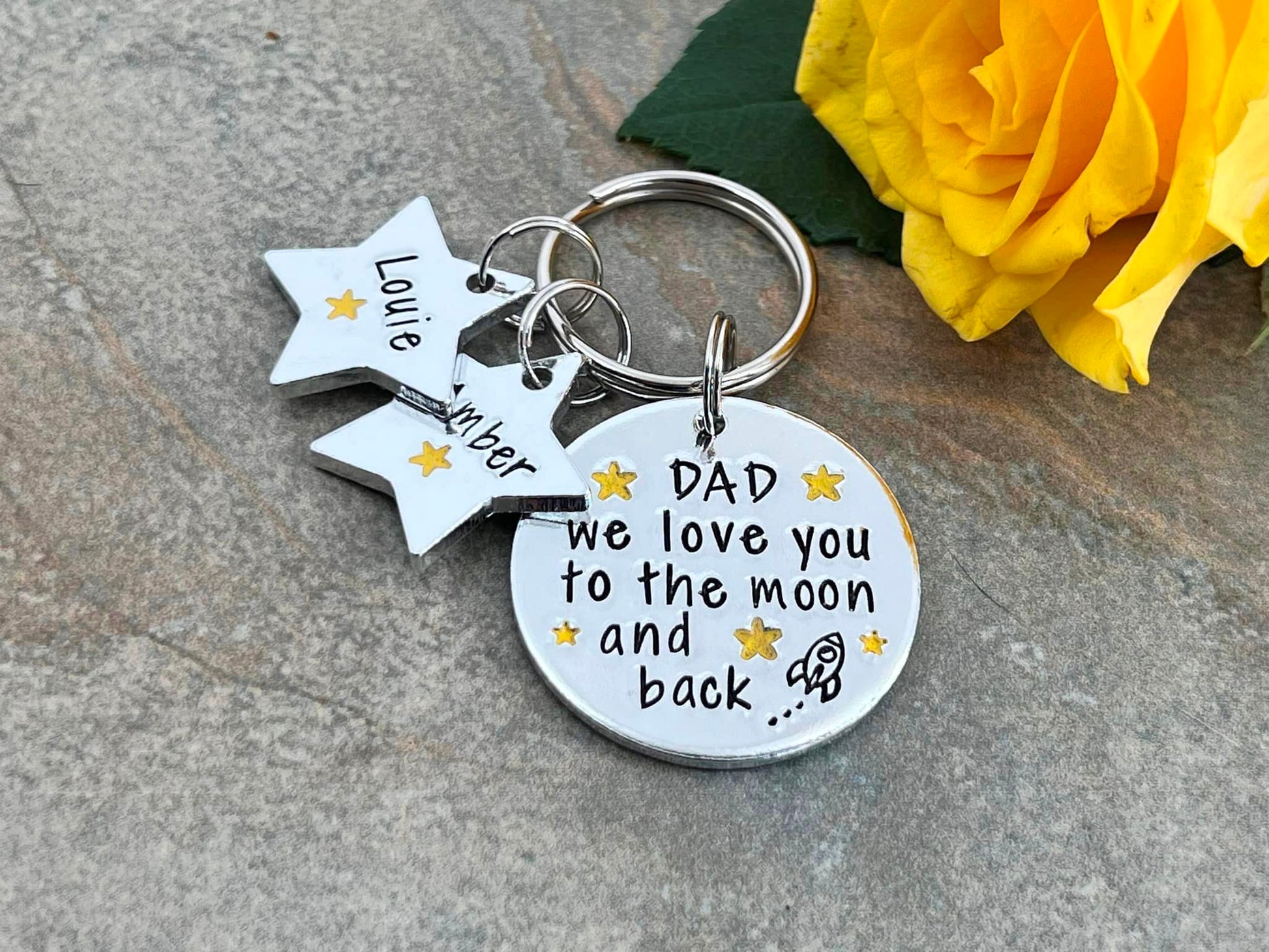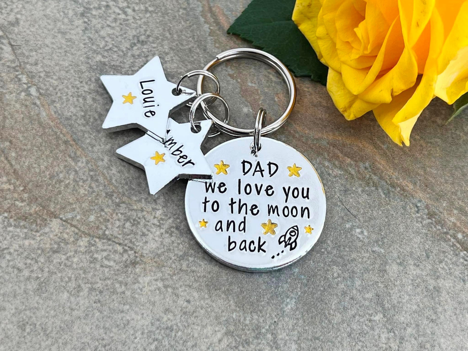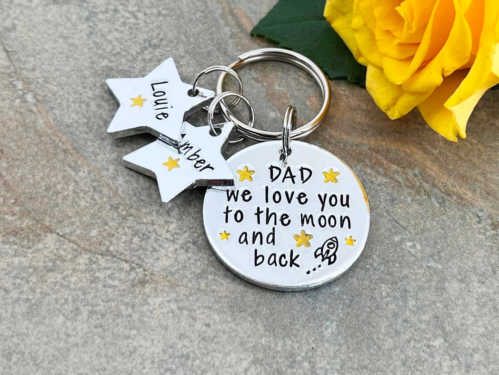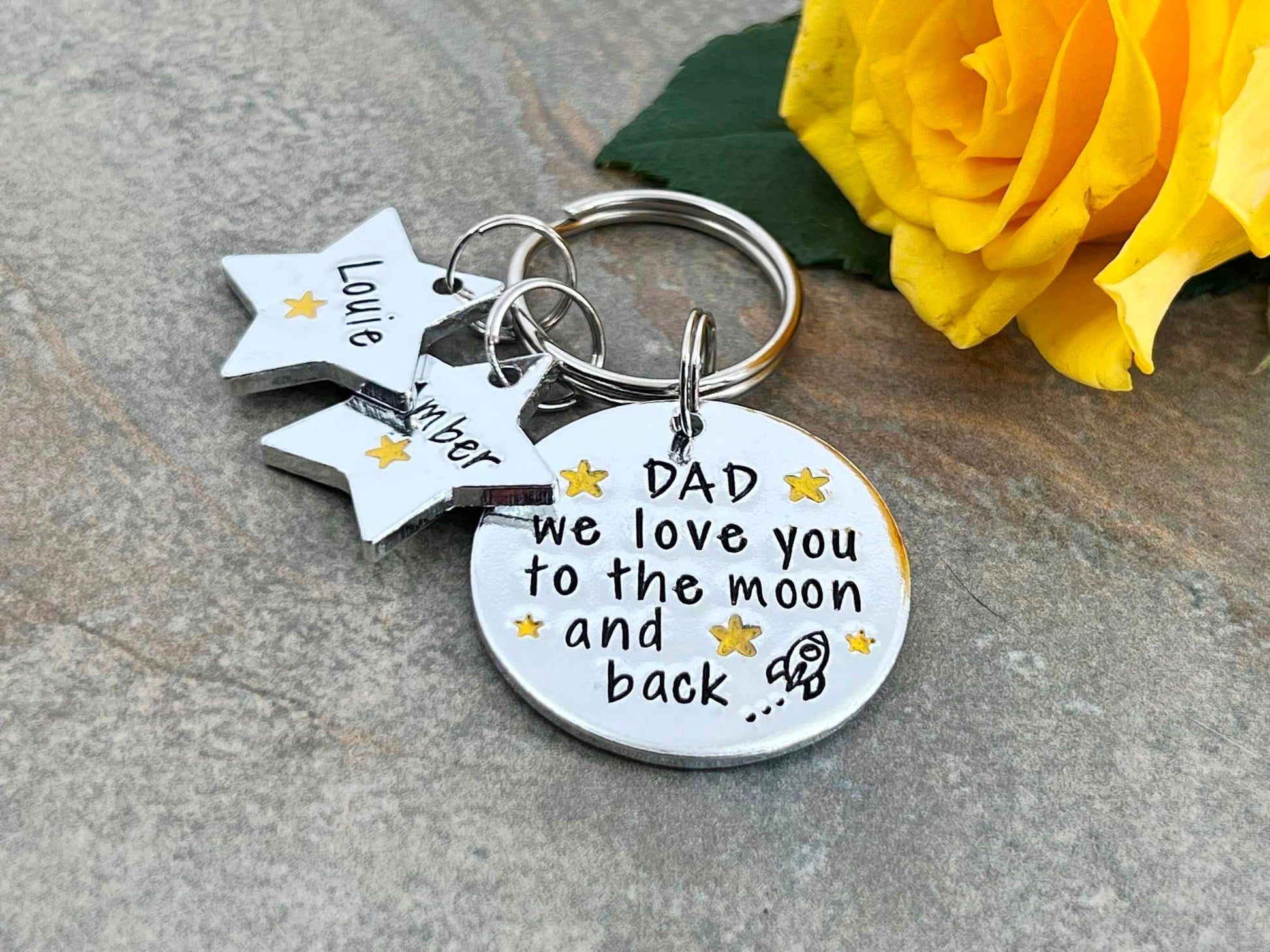 Hand stamped 'I love you to the moon and back' personalised keyring makes an ideal Father's Day gift for dad or grandad.