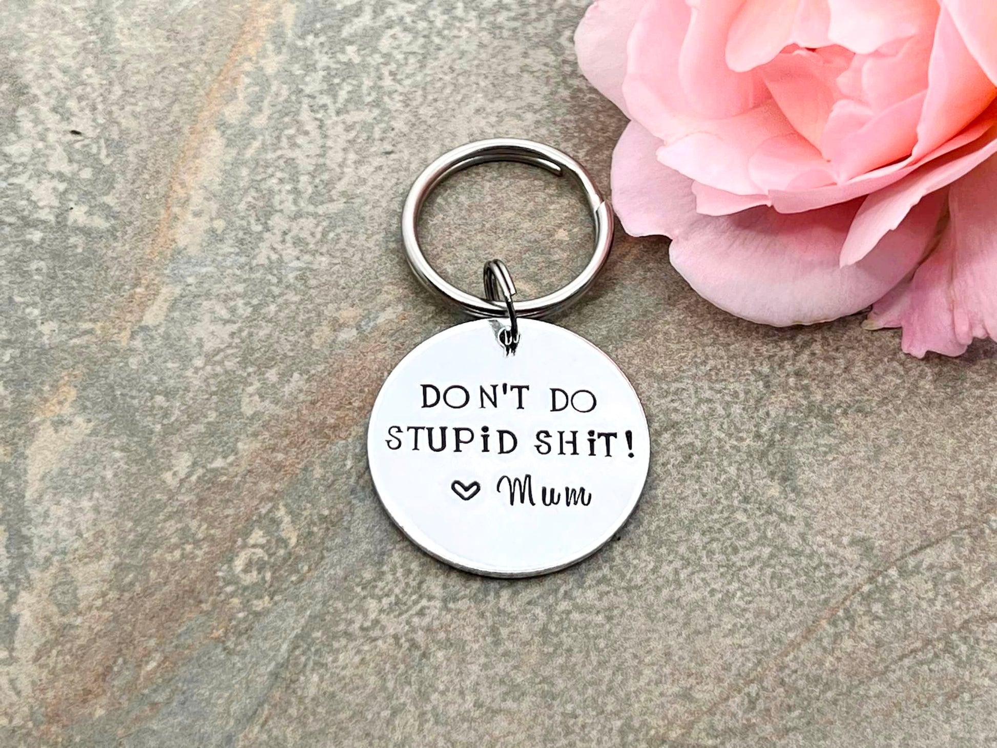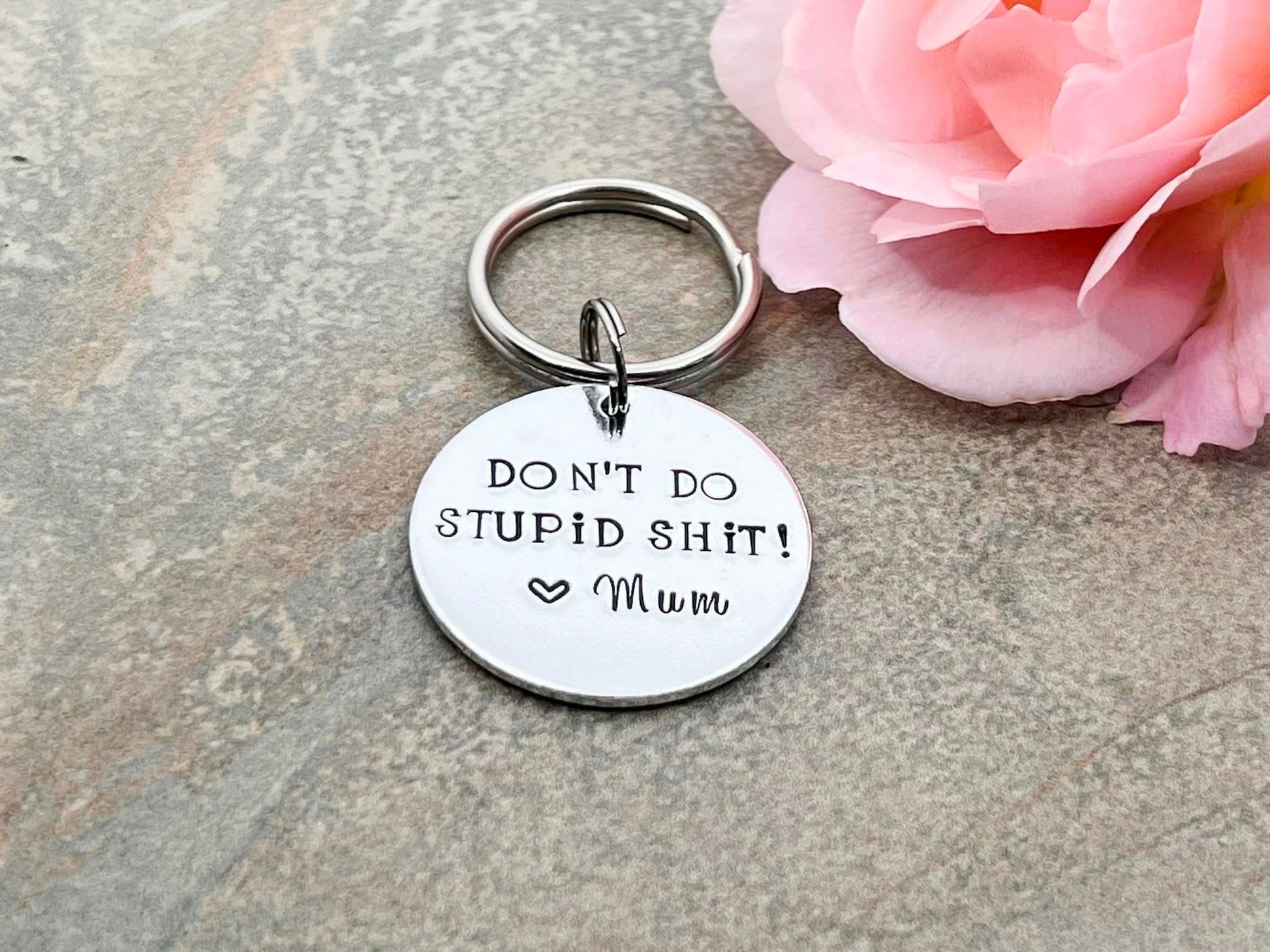 Don't do stupid shit. Hand stamped funny keyring for university student or new driver.