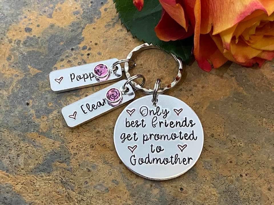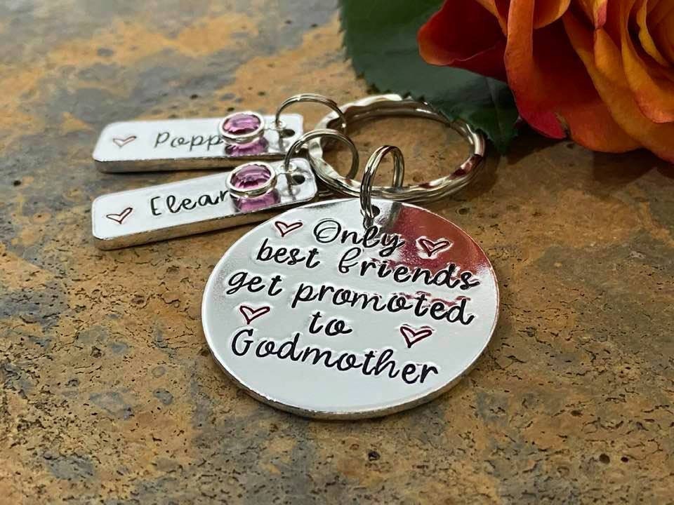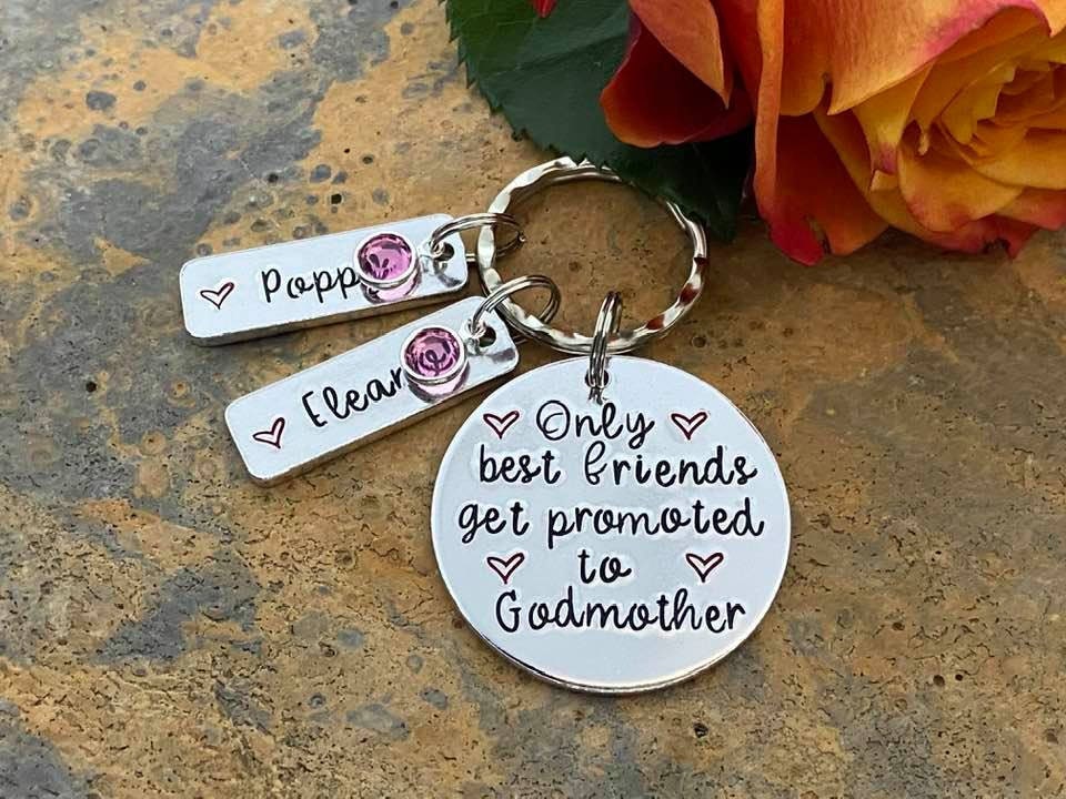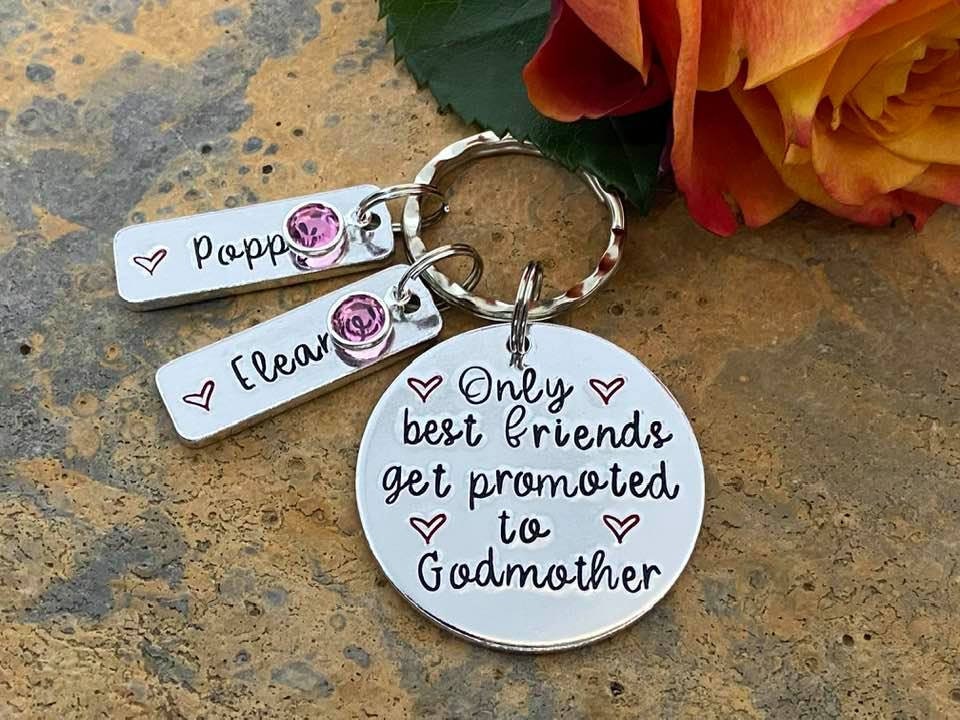 Hand stamped personalised Godmother keyring with Swarovski birthstones.