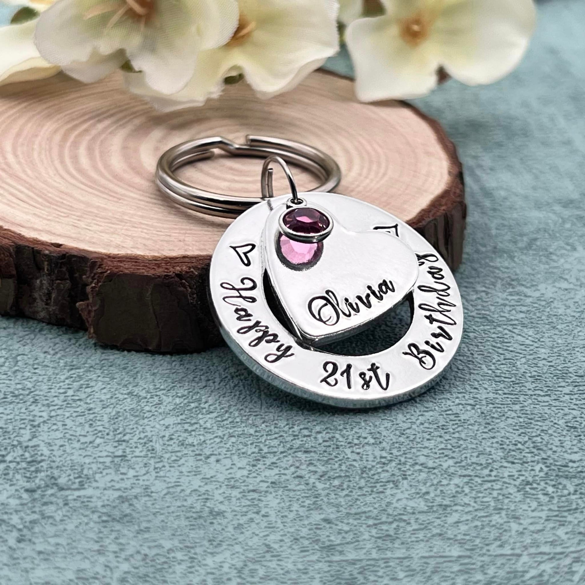 Hand stamped Happy 21st Birthday personalised keyring with birthstone. Ideal 21 birthday gift.