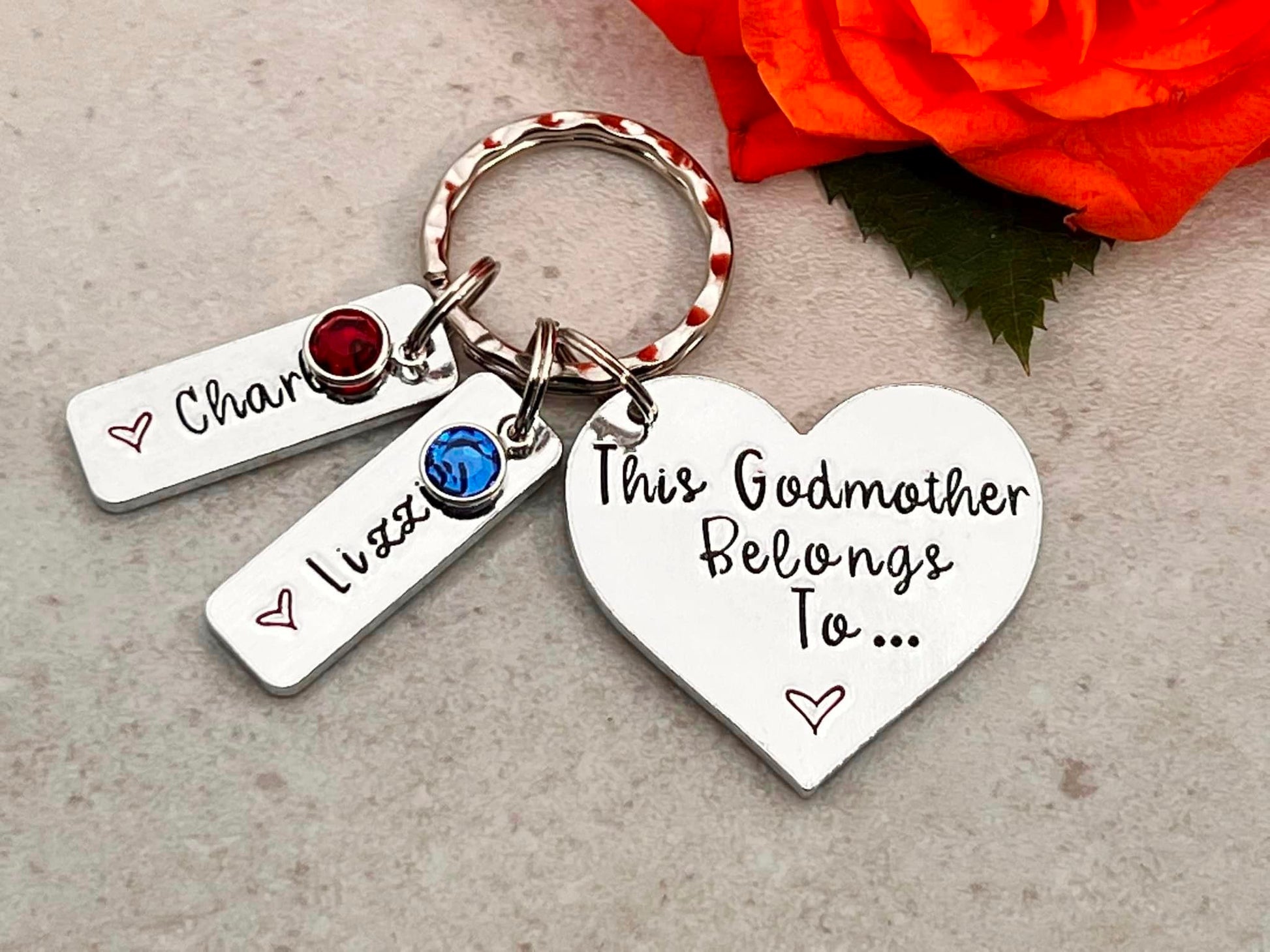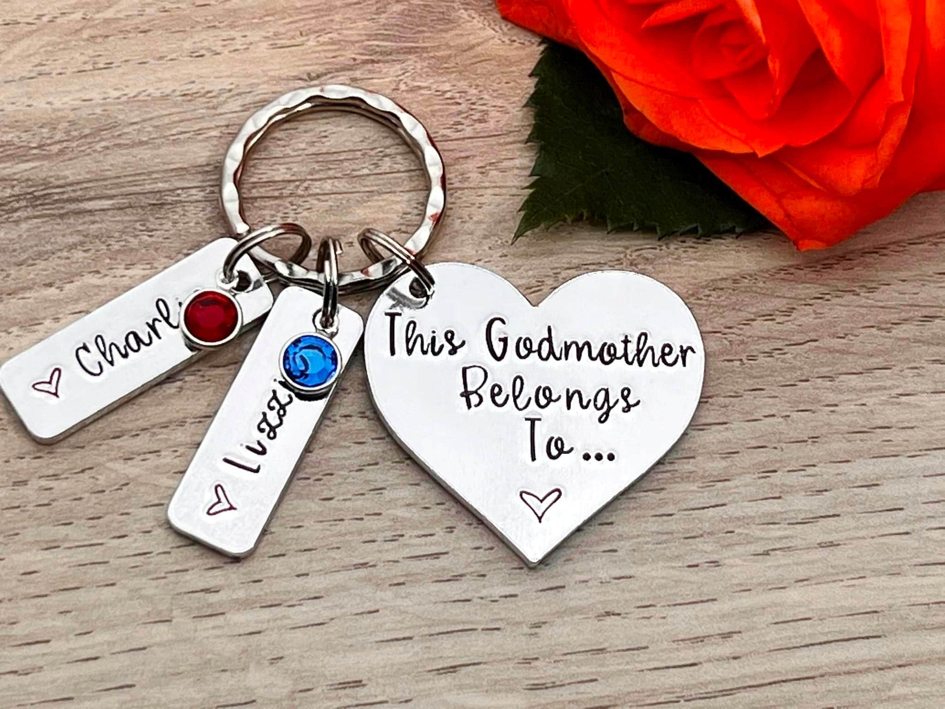 Hand stamped 'This Godmother belongs to...' personalised keyring with Swarovski birthstones.