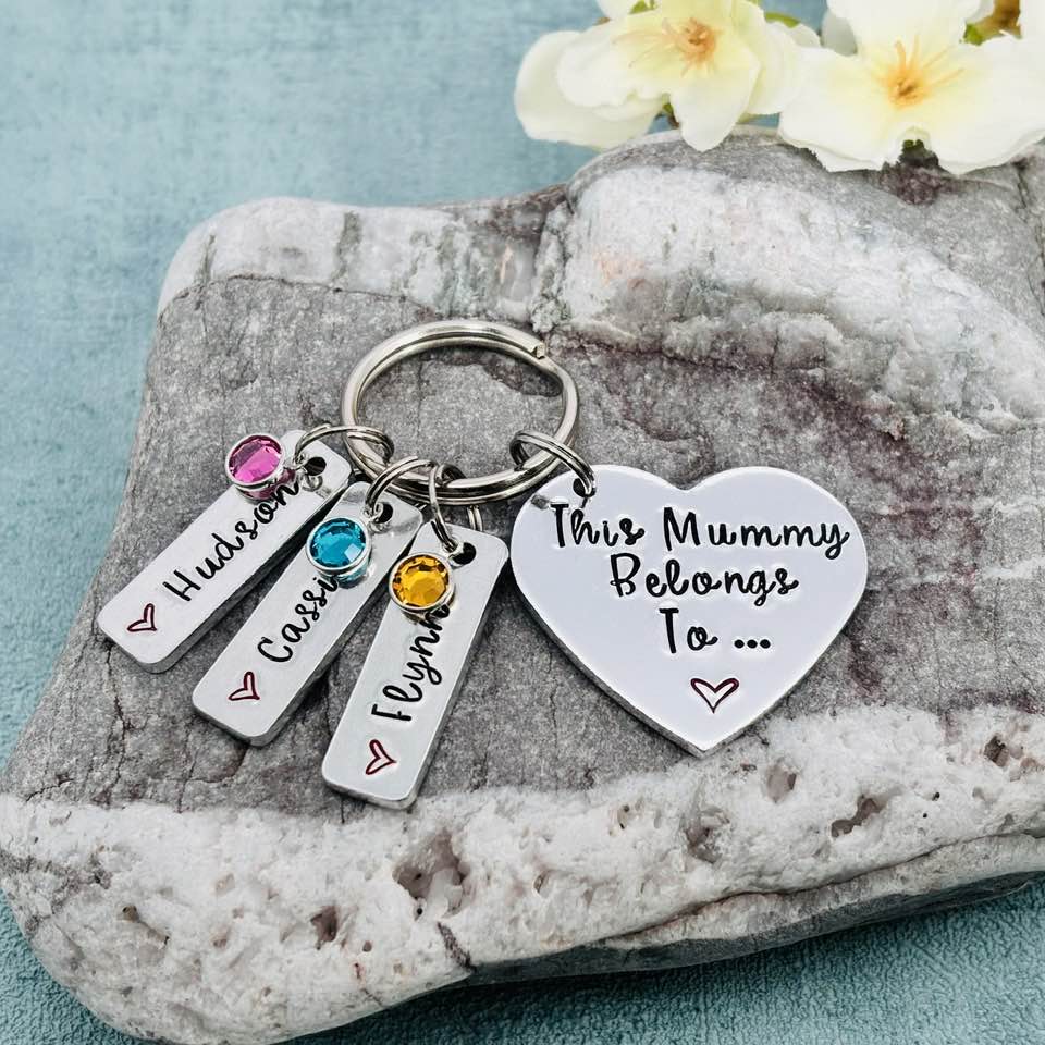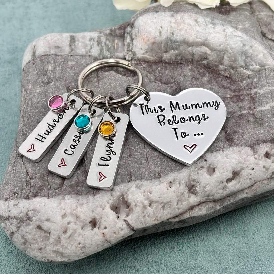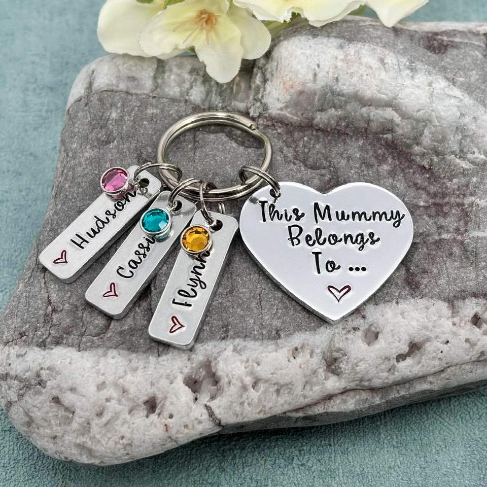 Hand stamped 'This Mummy belongs to...' mummy keyring with birthstones.
