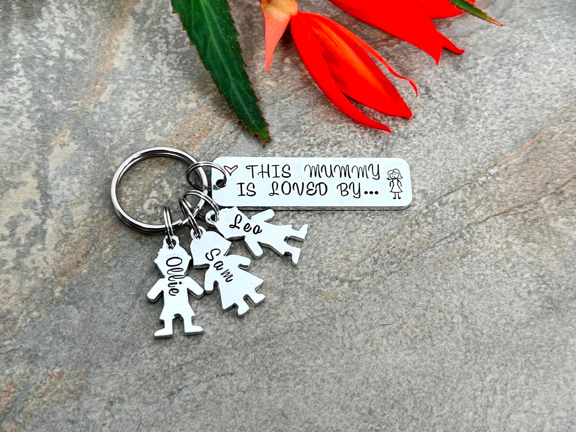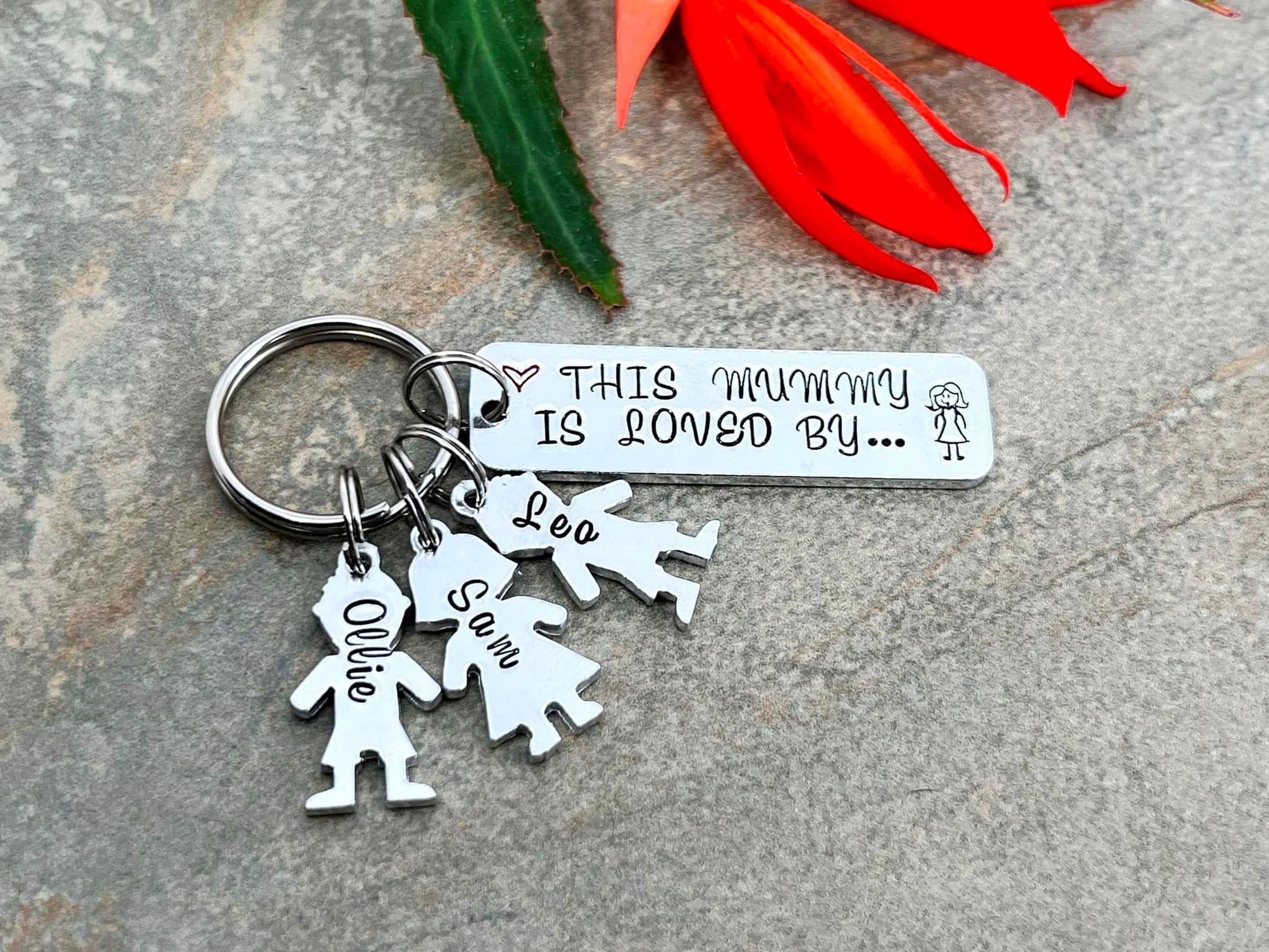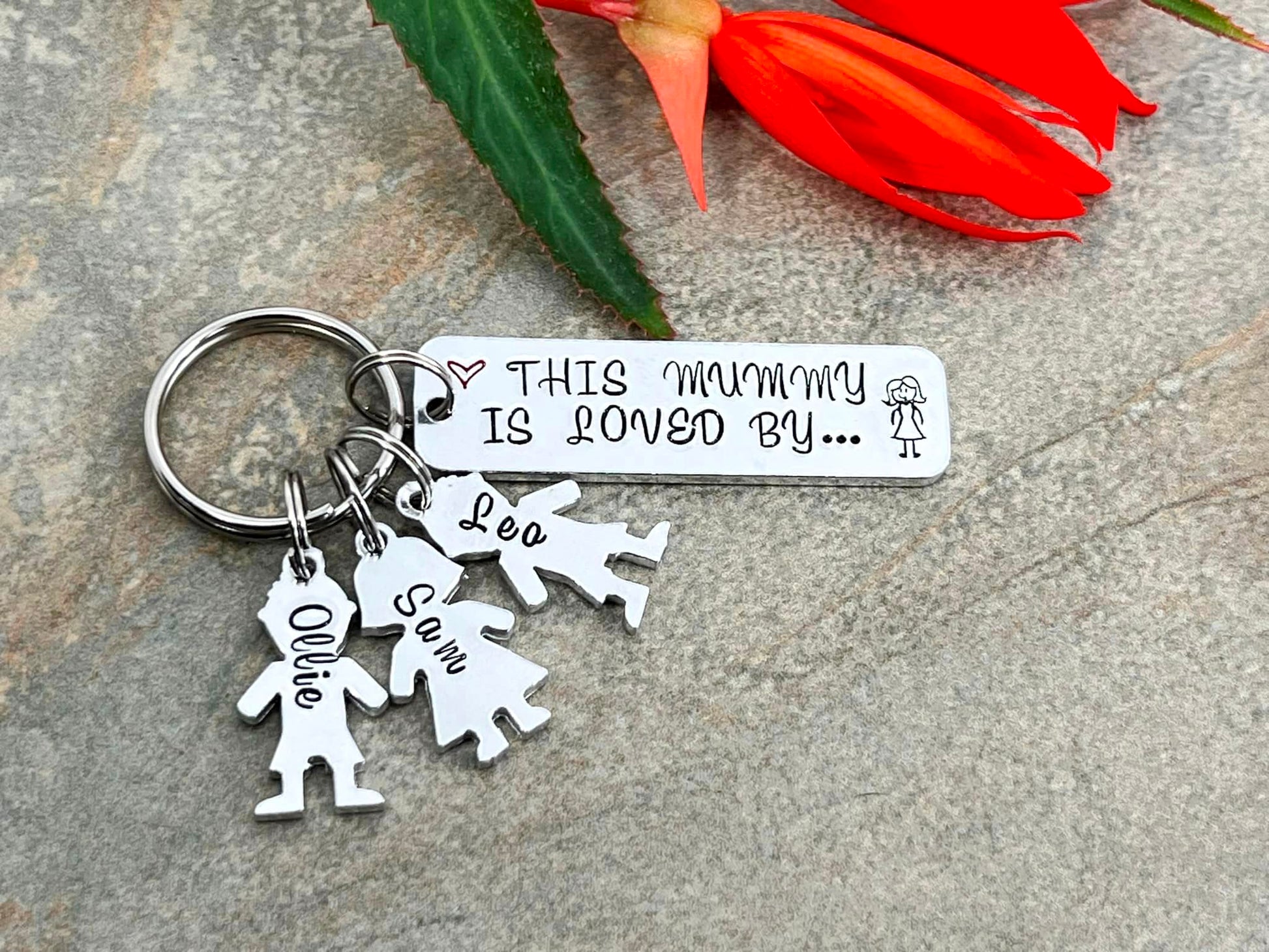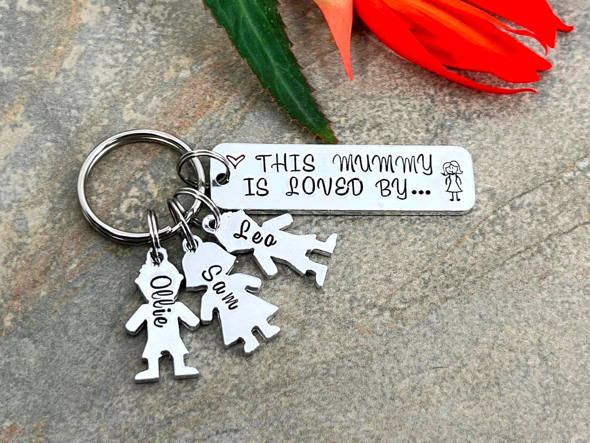 Hand stamped 'This Mummy is loved by' personalised keyring.