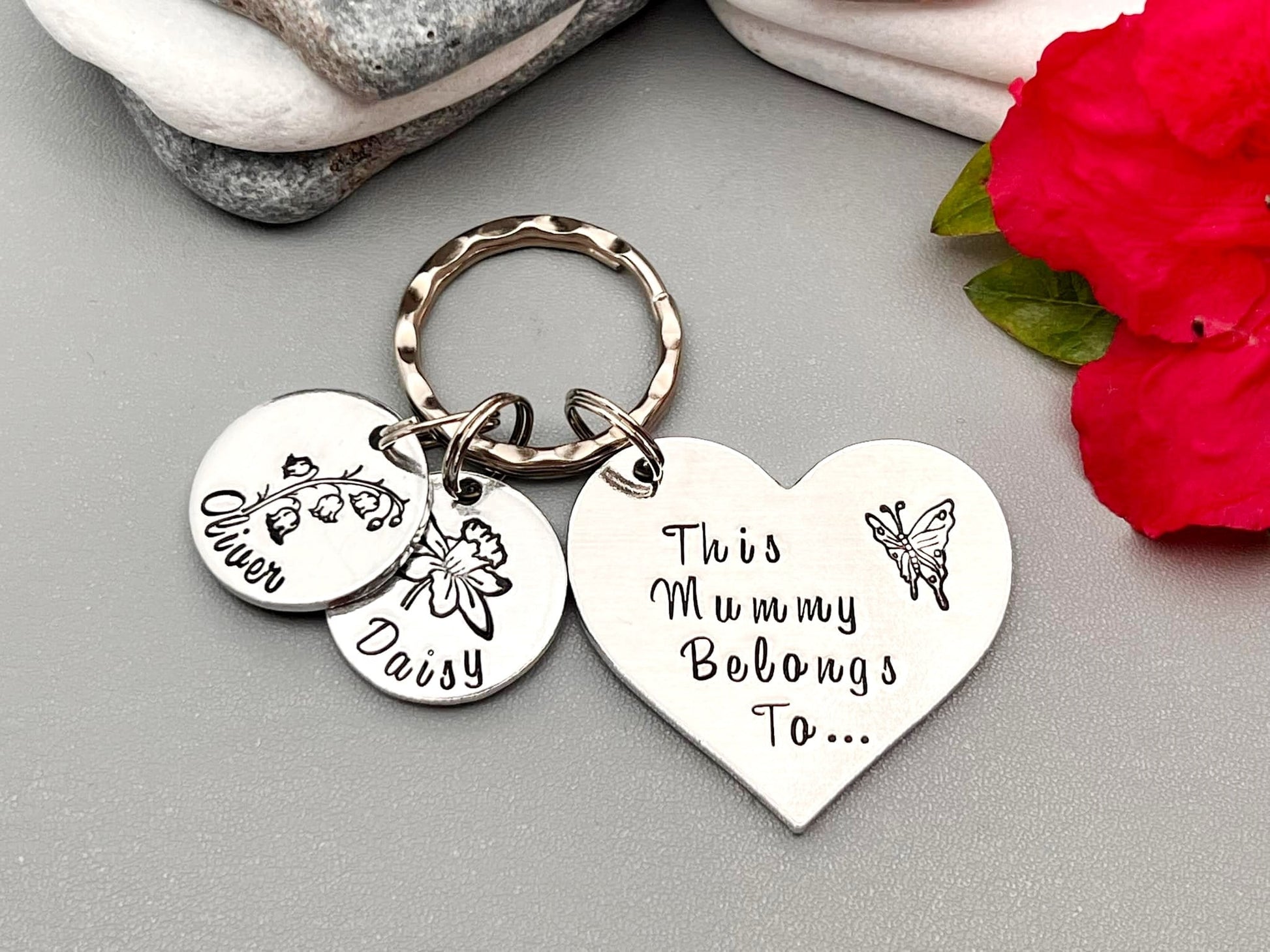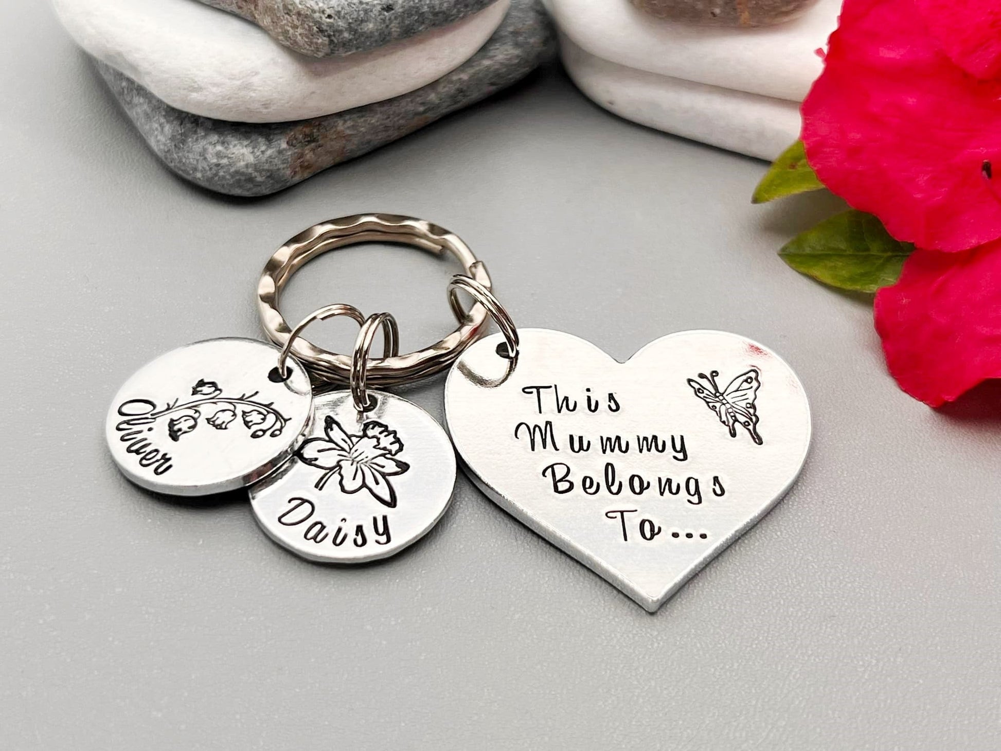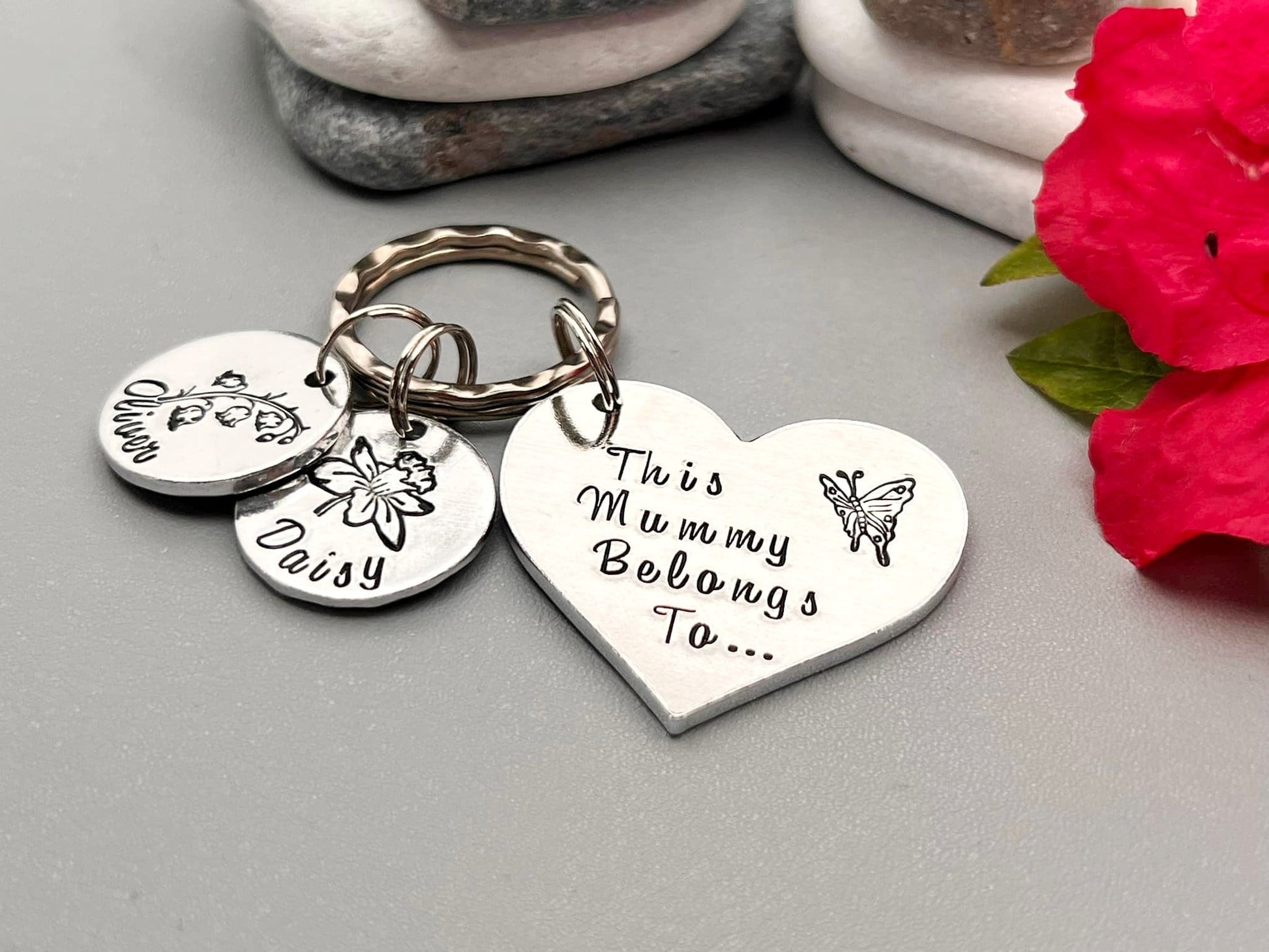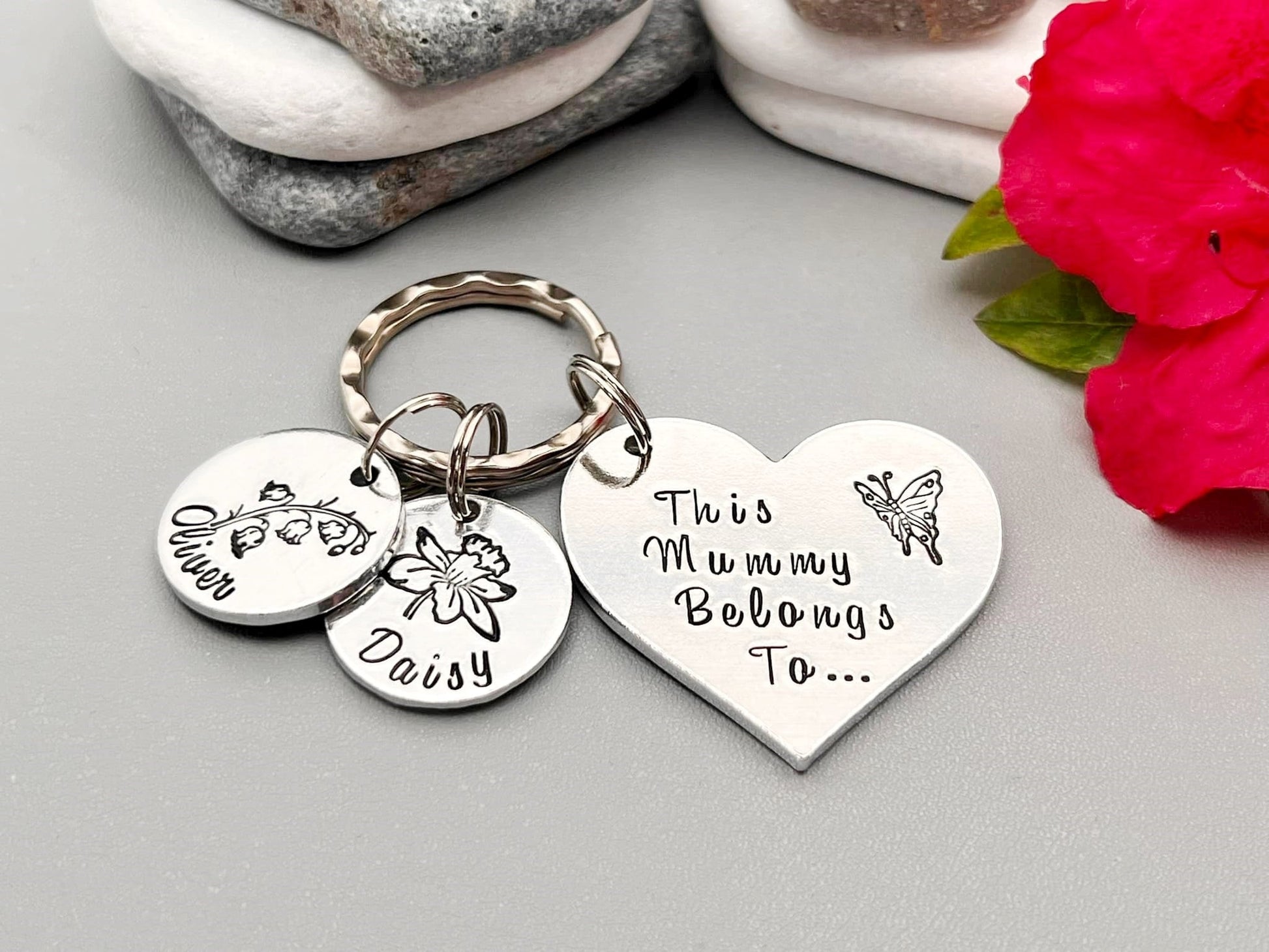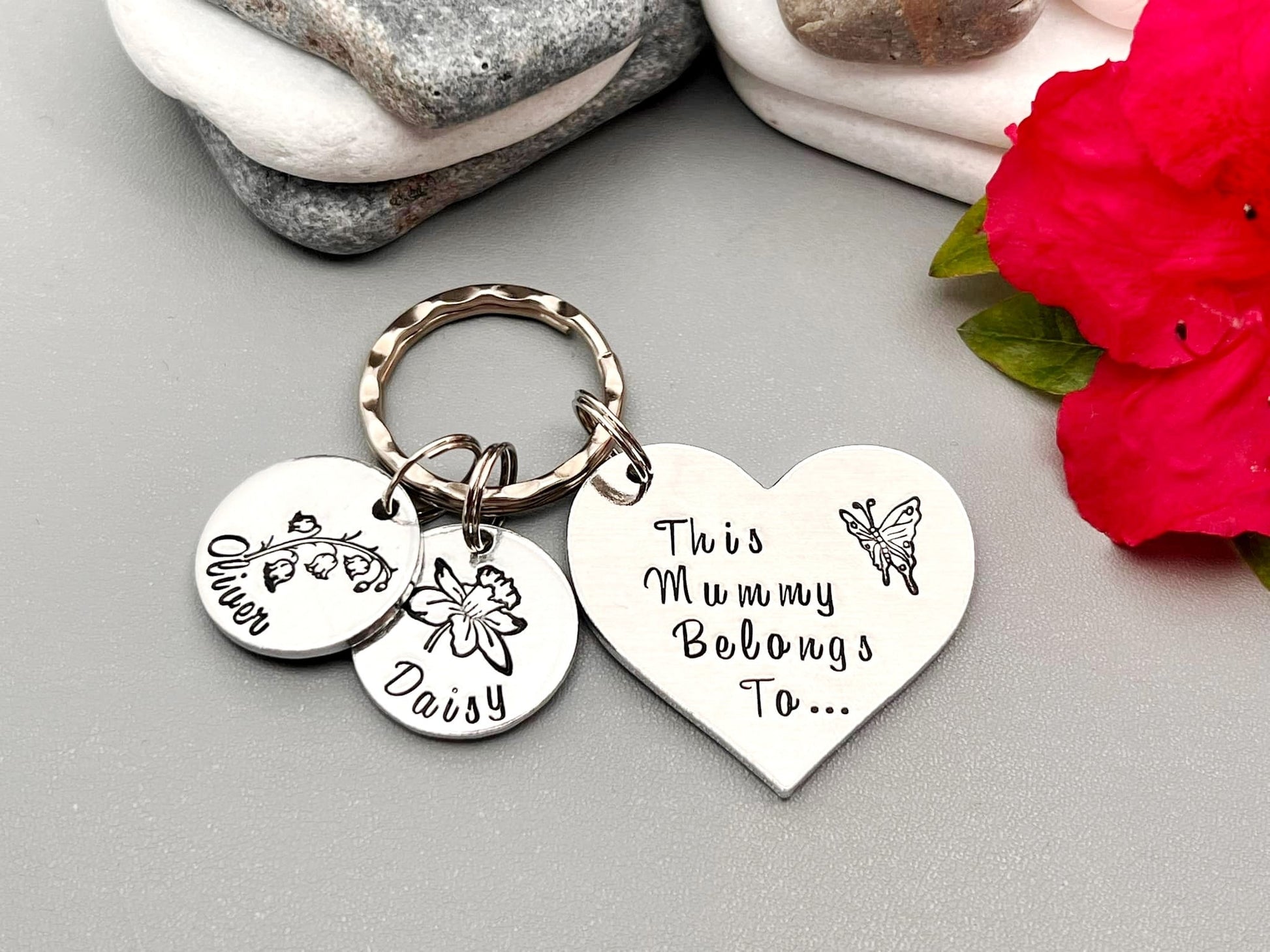 Hand stamped 'This Mummy Belongs To' personalised keyring with birth month flowers.