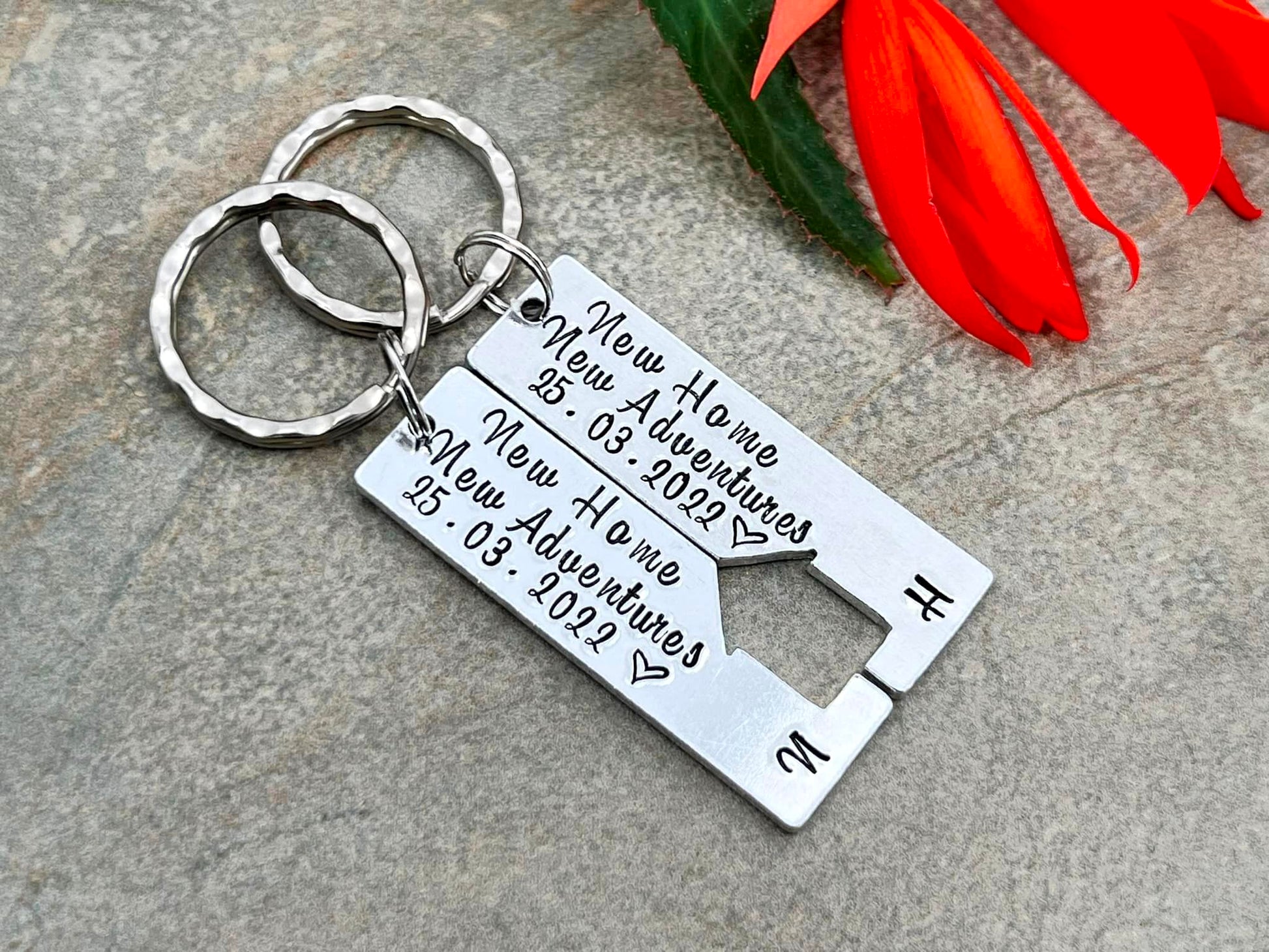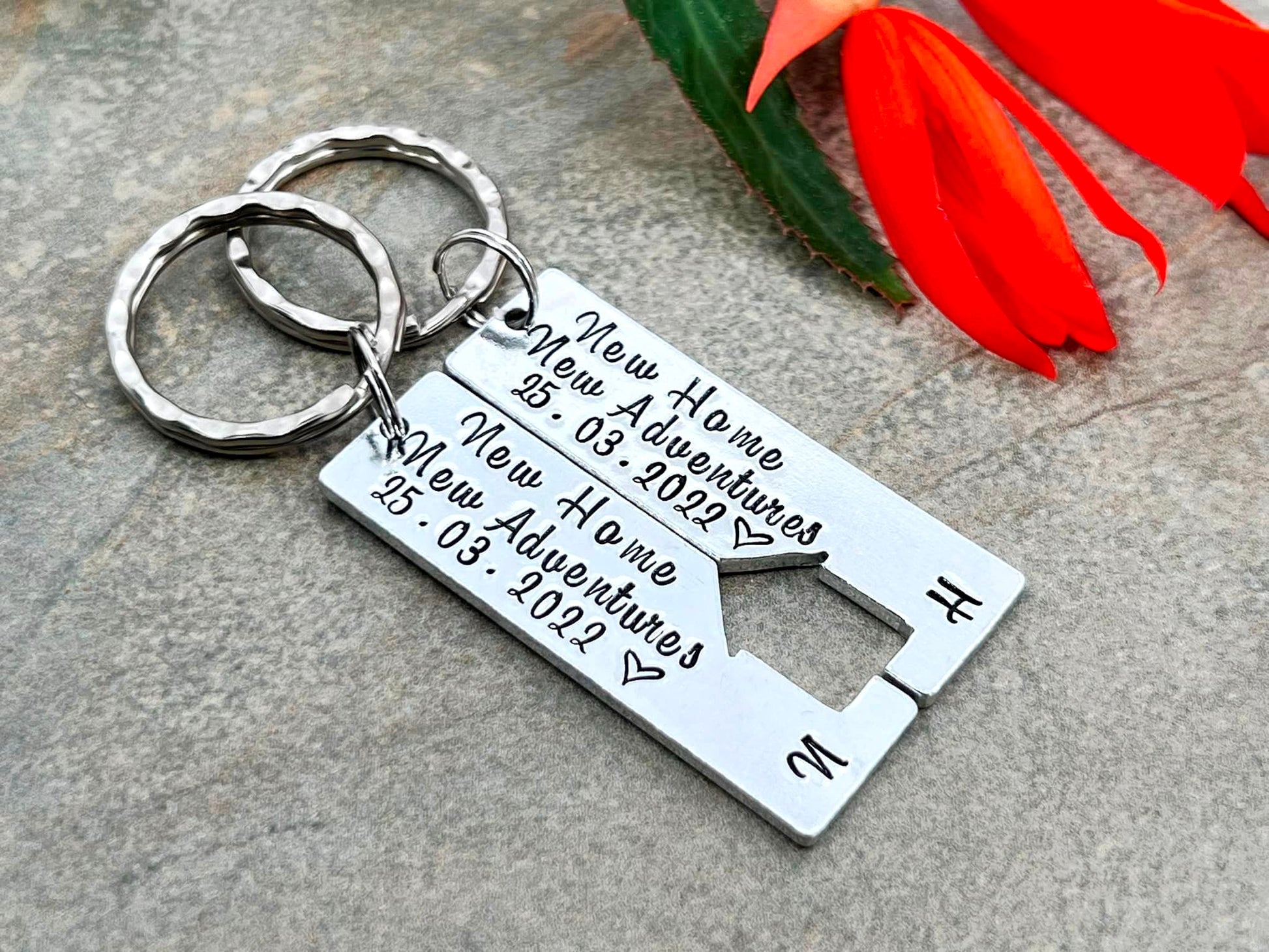 New Home, New Adventures hand stamped set of 2 keyrings.