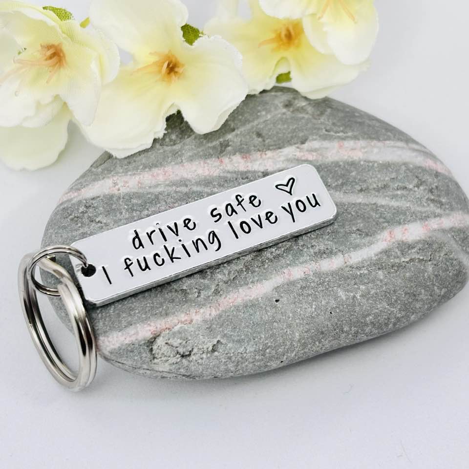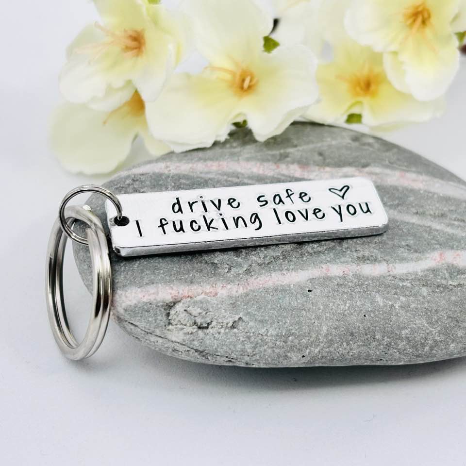 Hand stamped 'Drive safe I fucking love you' keyring.