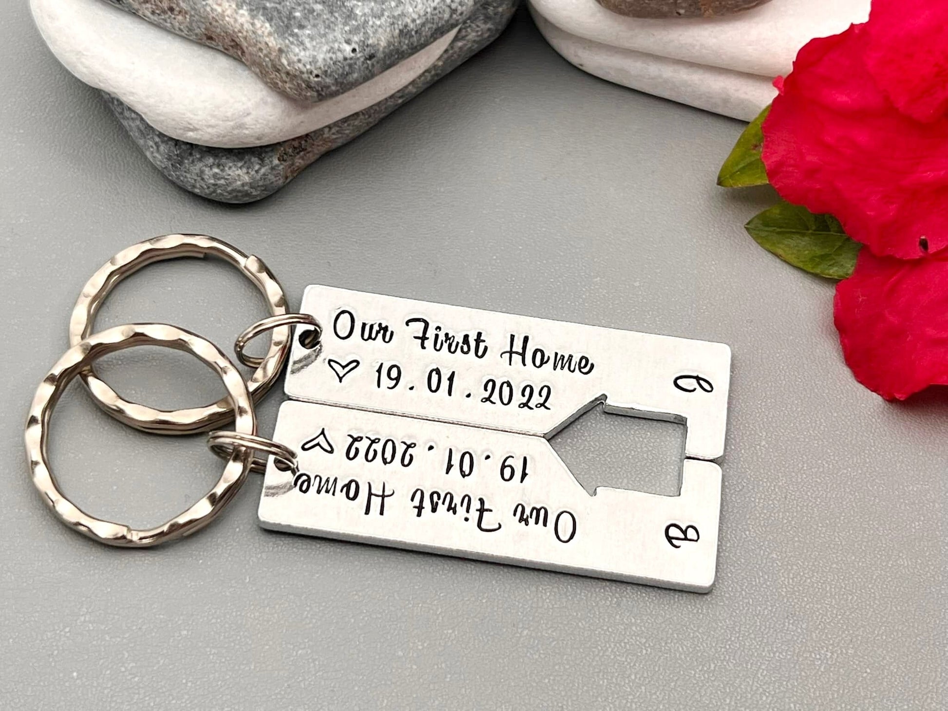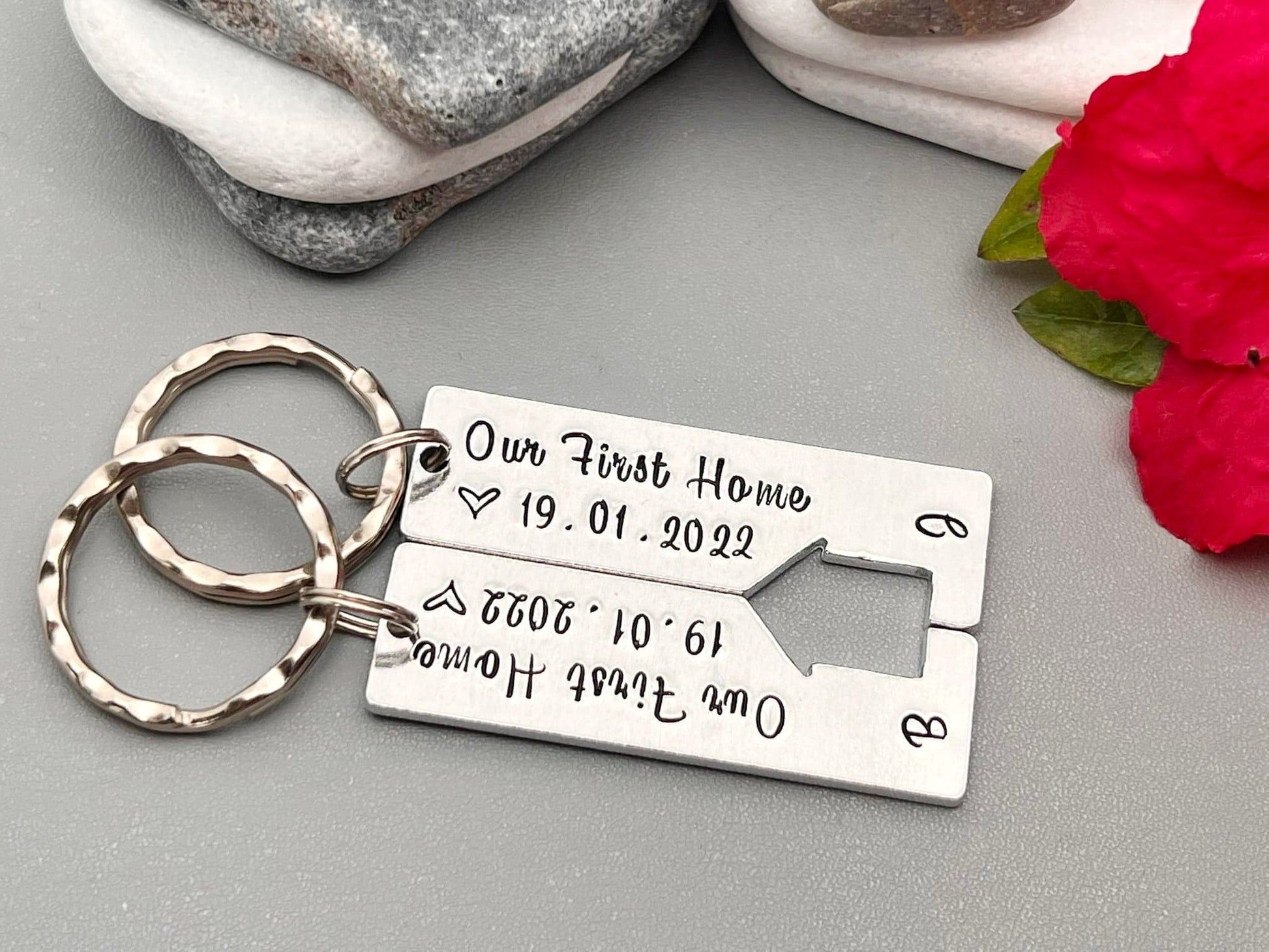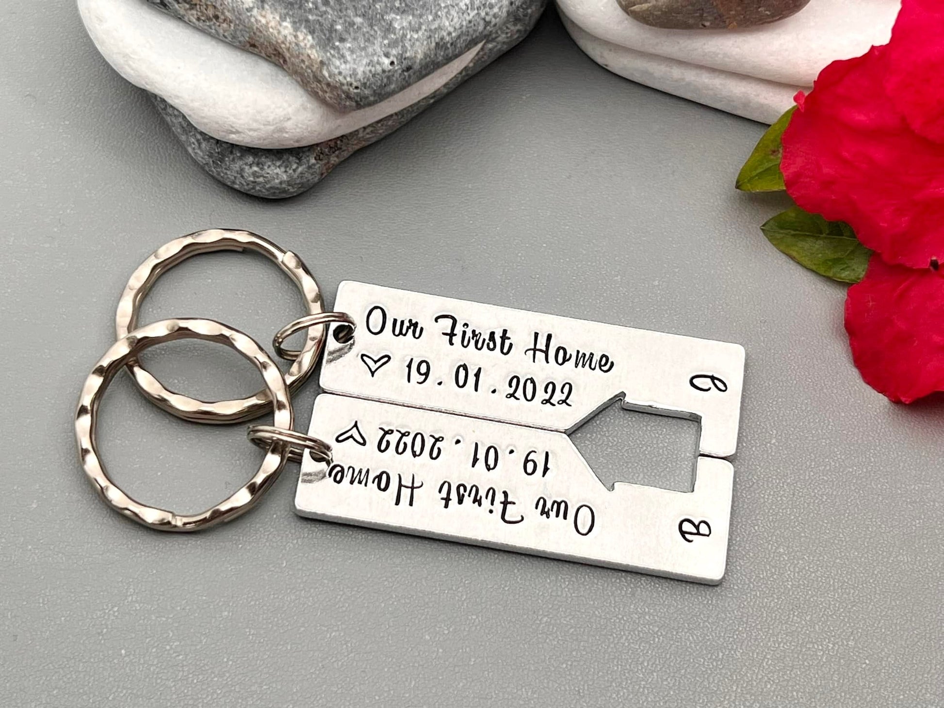 Our First Home hand stamped set of 2 keyrings.