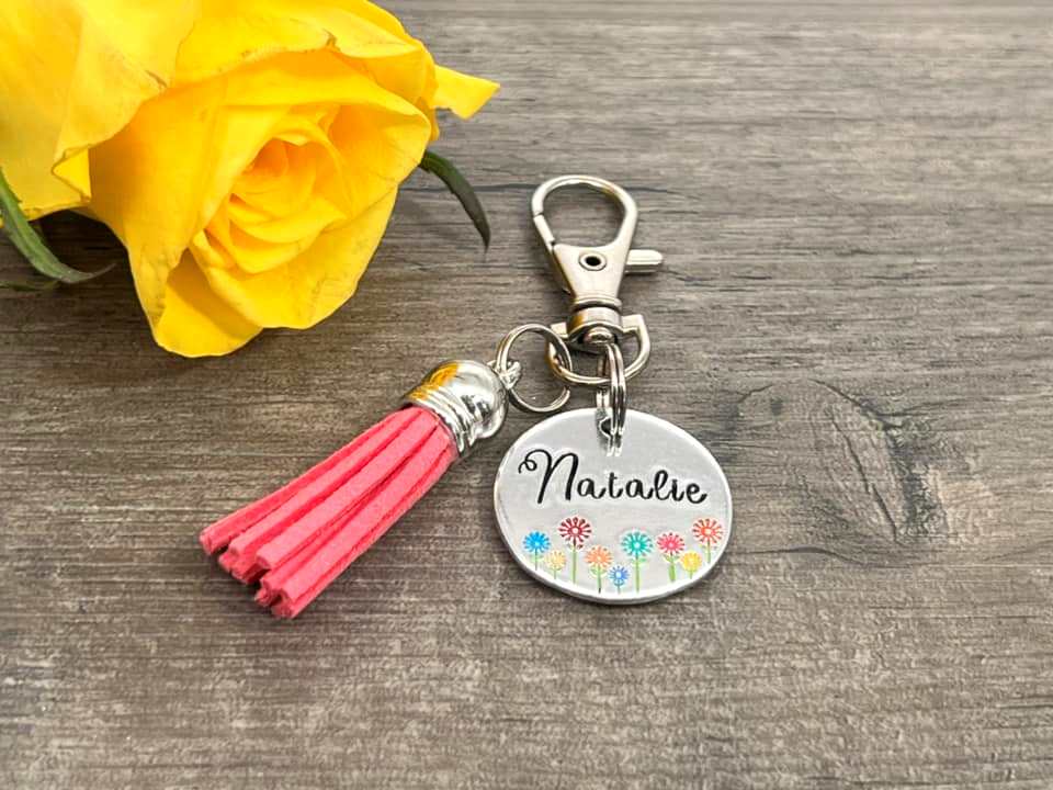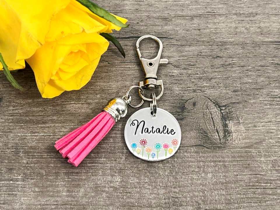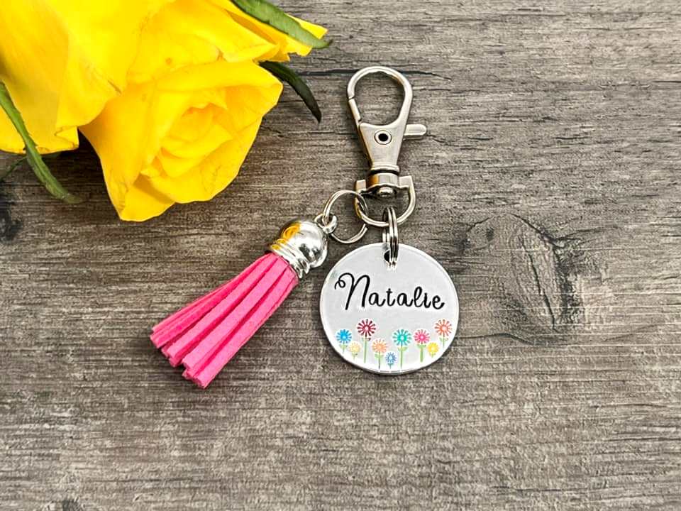 Hand stamped personalised bag charm.