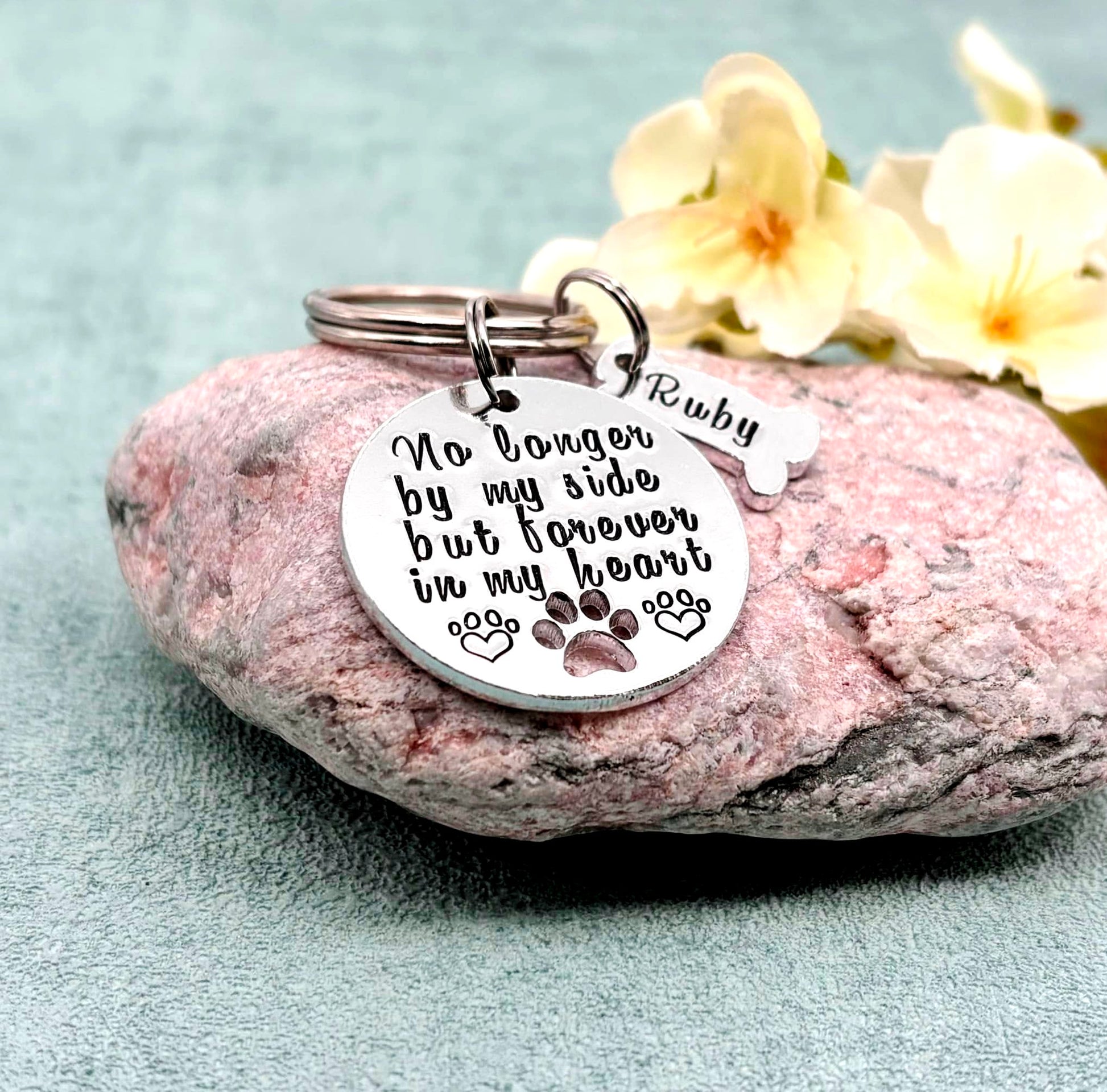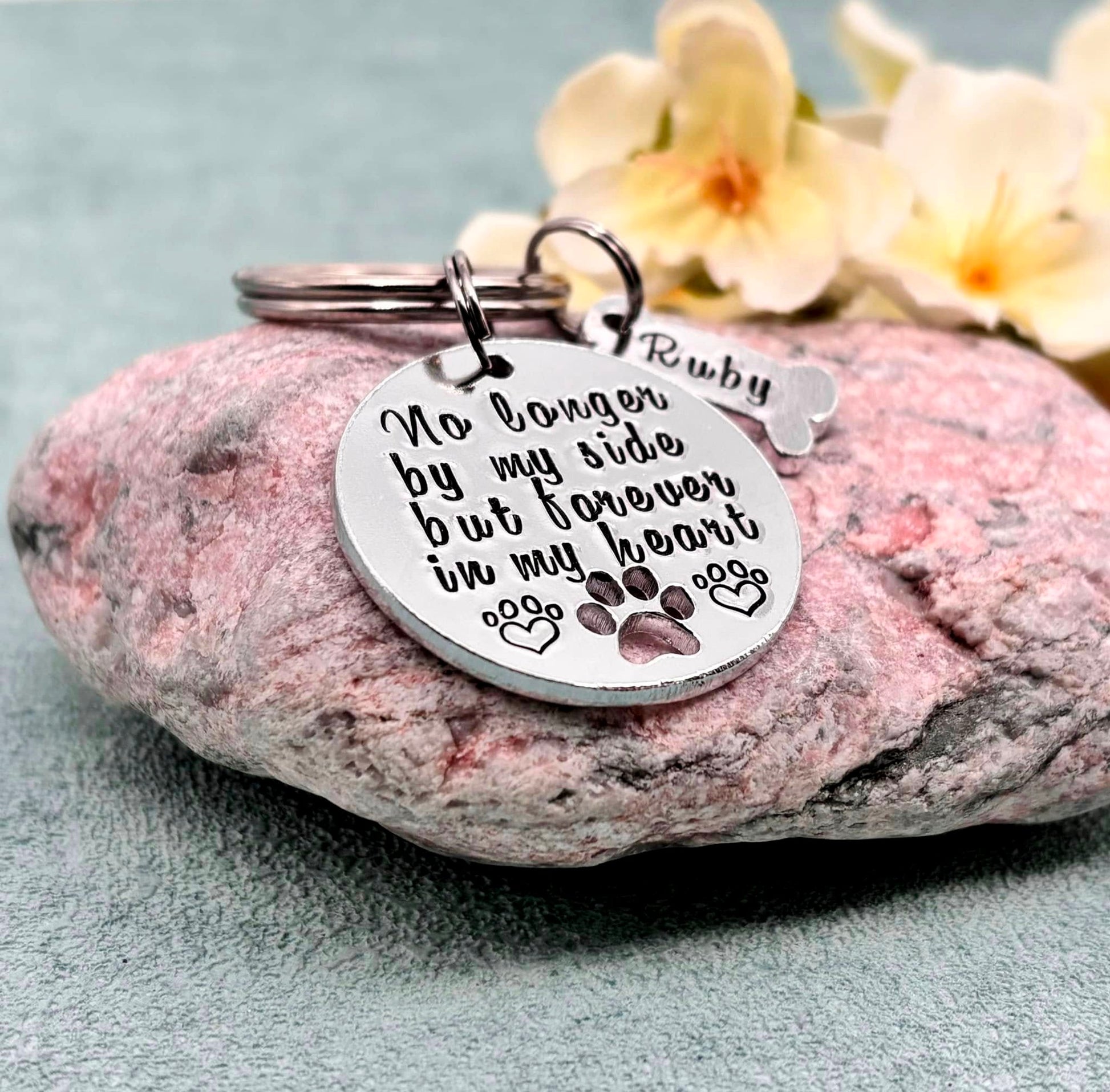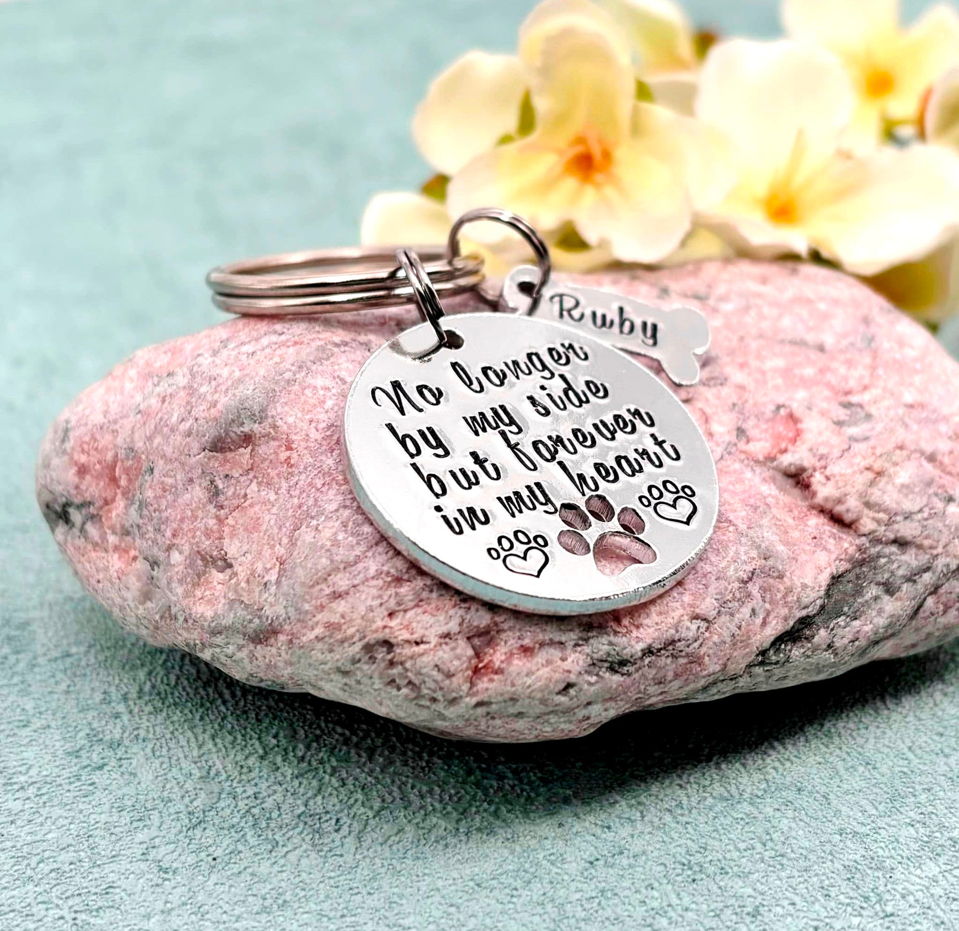 Hand stamped dog memorial keyring. No longer by my side but forever in my heart.