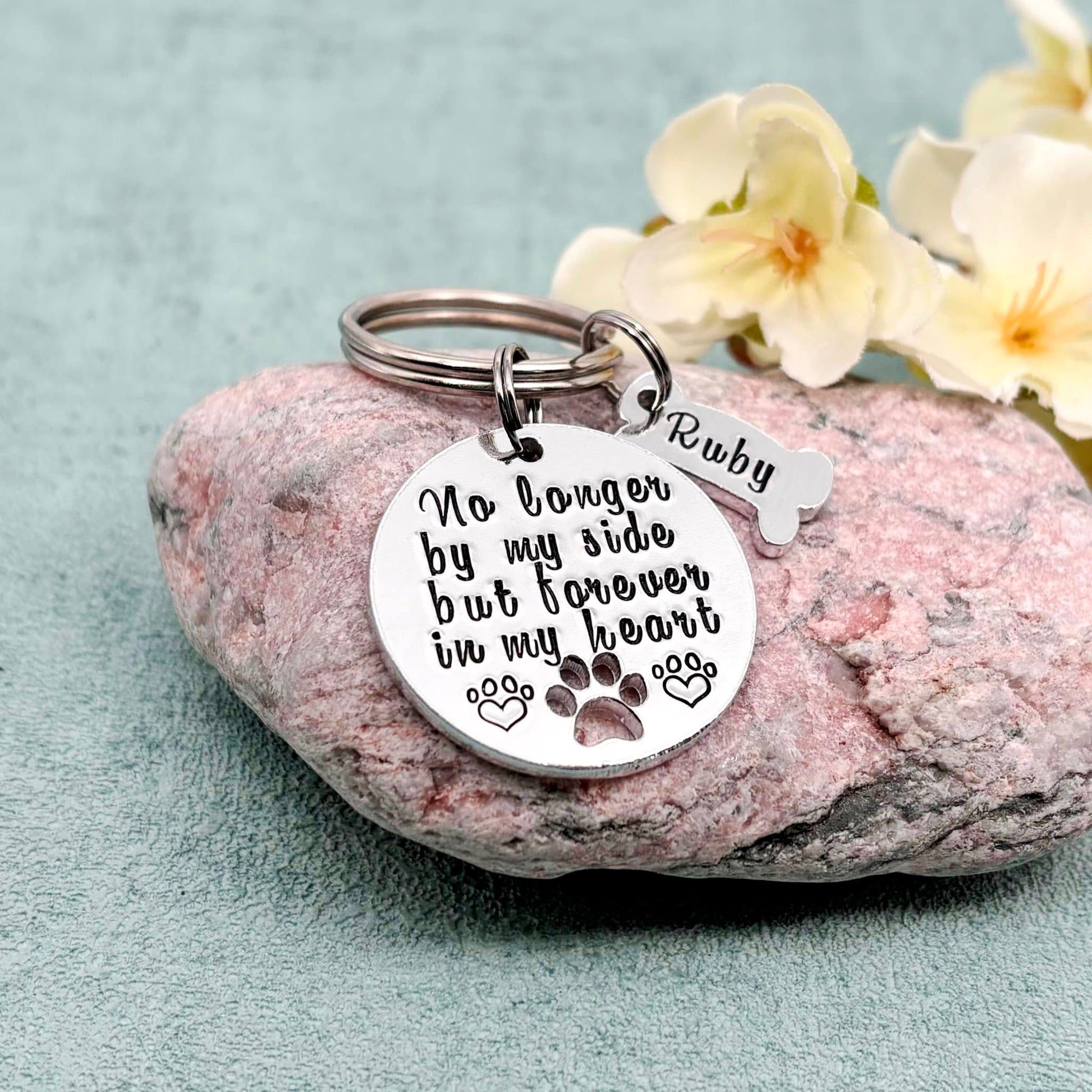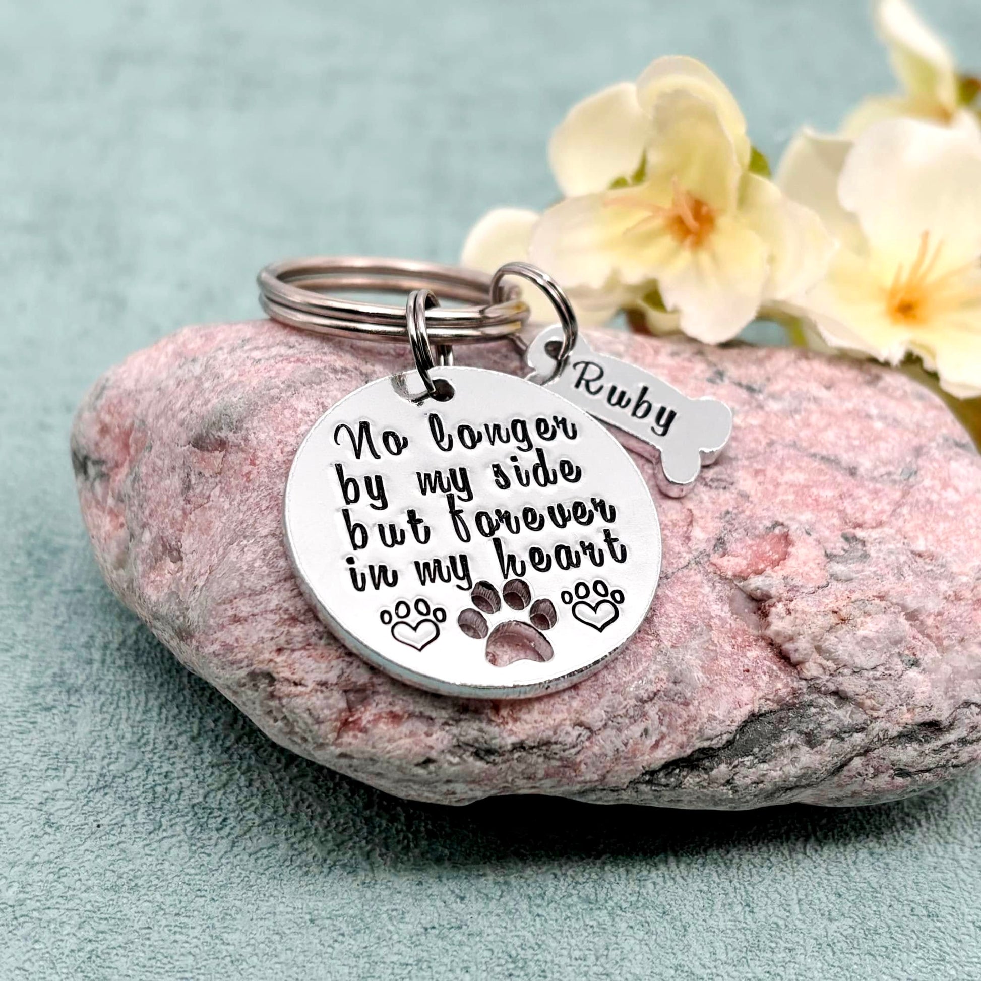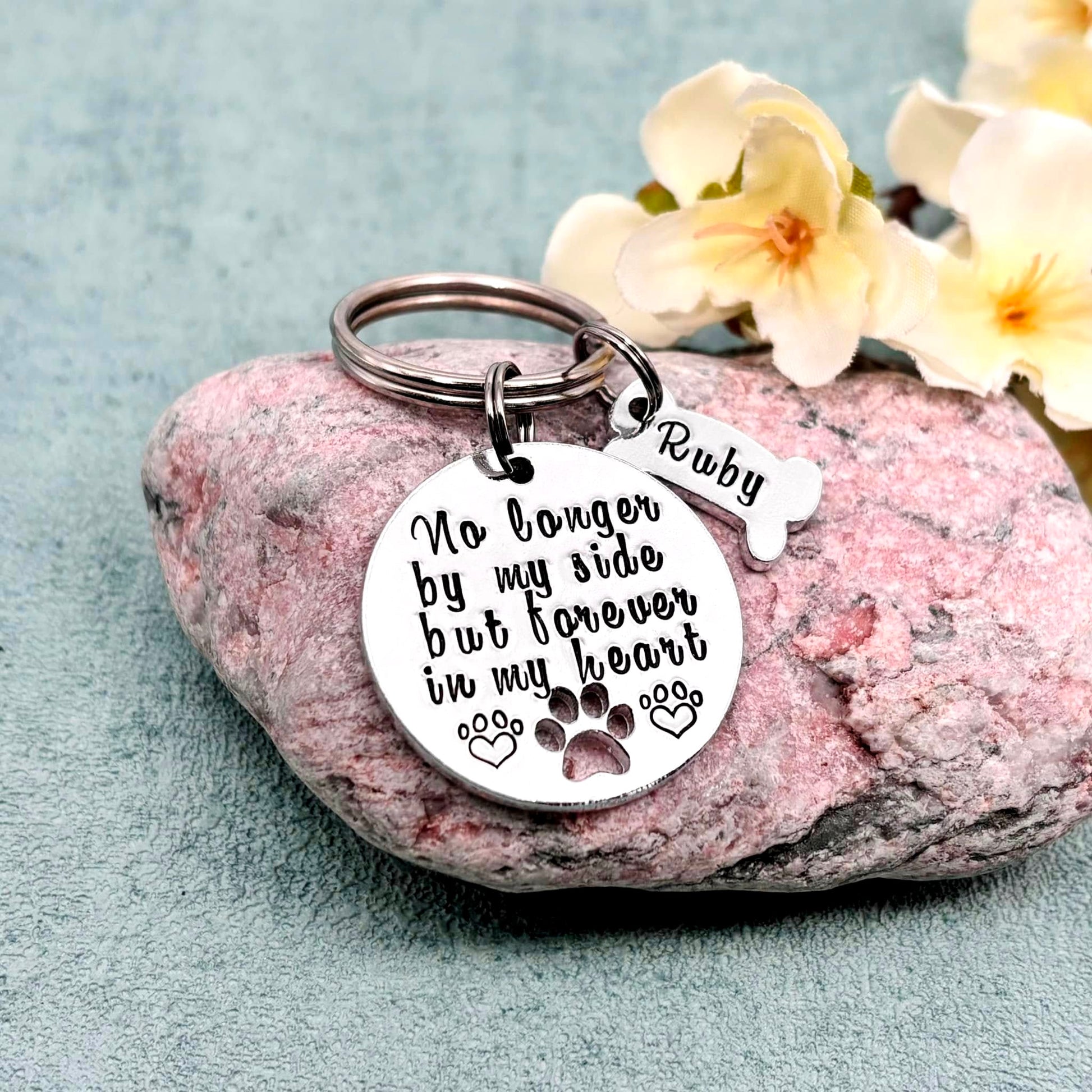 Hand stamped dog memorial keyring. No longer by my side but forever in my heart.