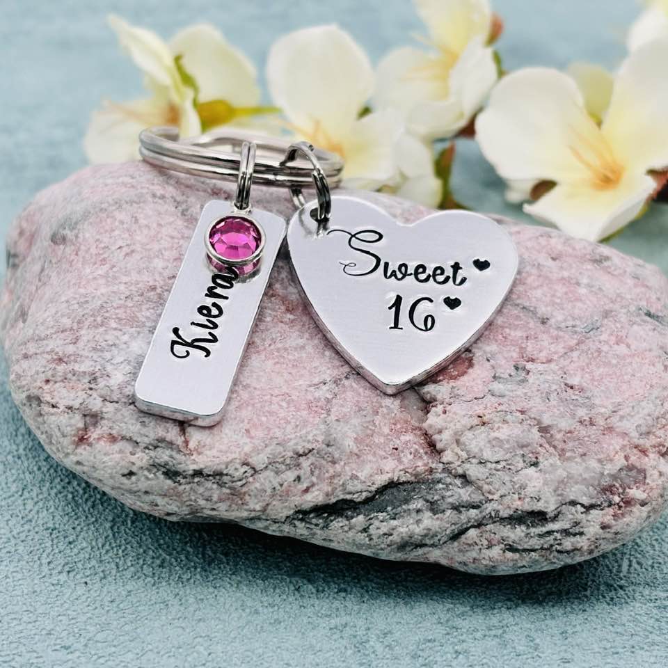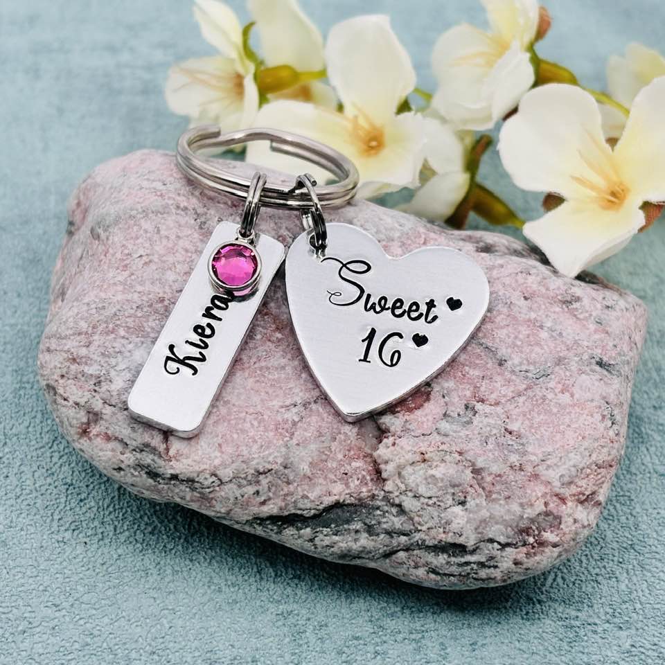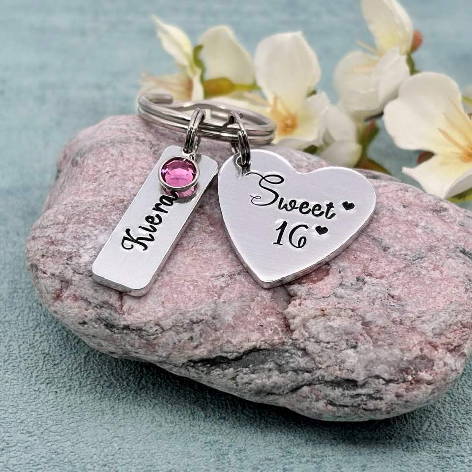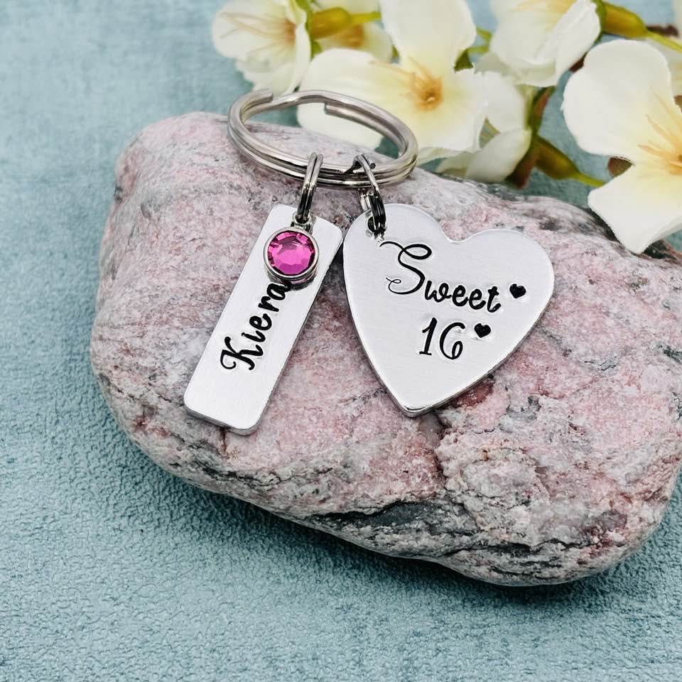 Hand stamped Sweet 16 personalised keyring with birthstone. Ideal 16 birthday gift.