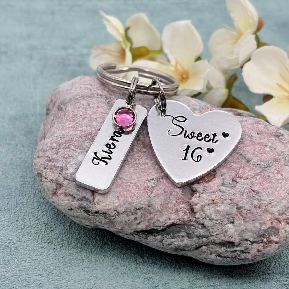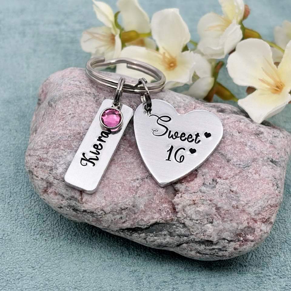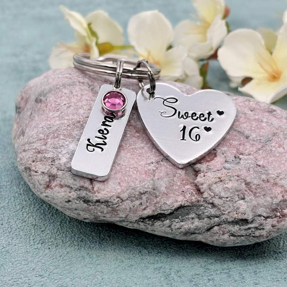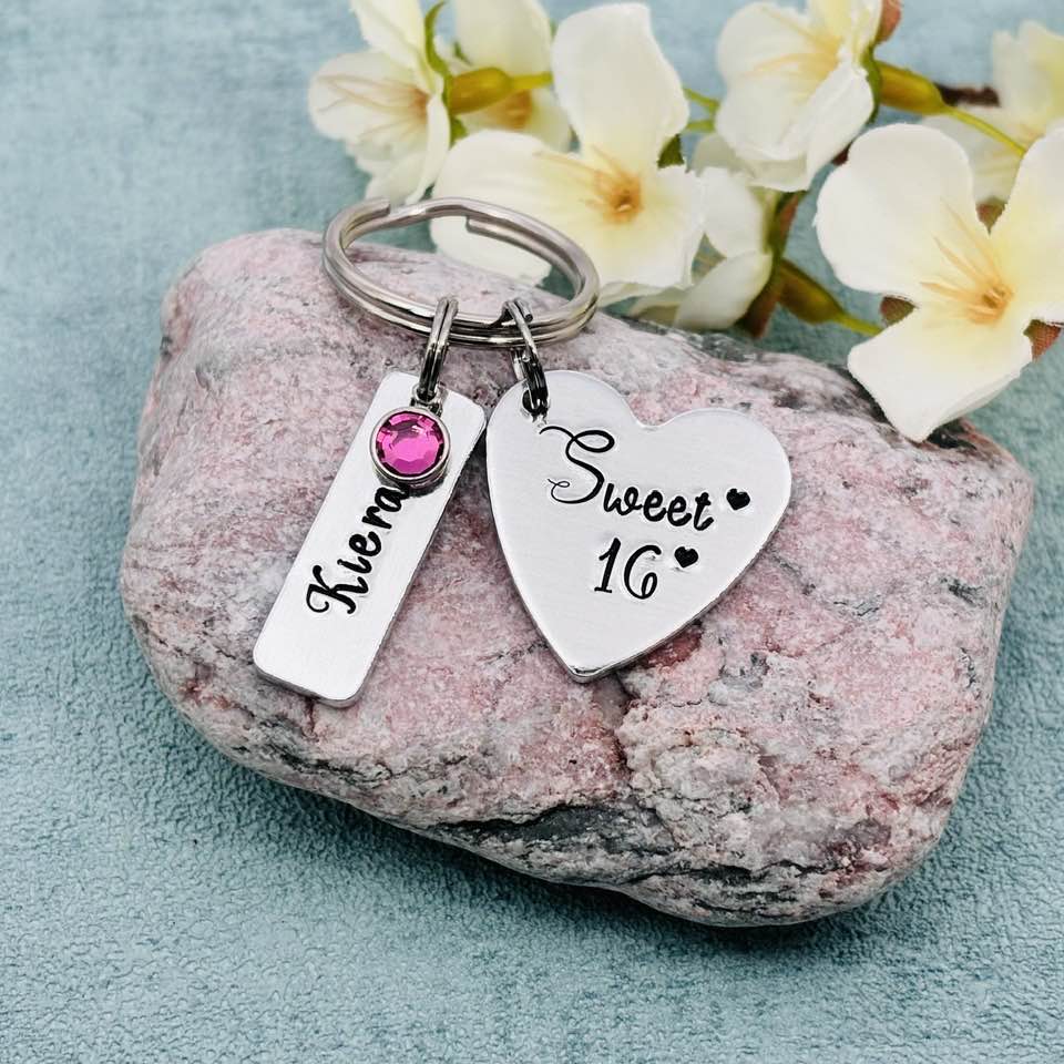 Hand stamped Sweet 16 personalised keyring with birthstone. Ideal 16 birthday gift.