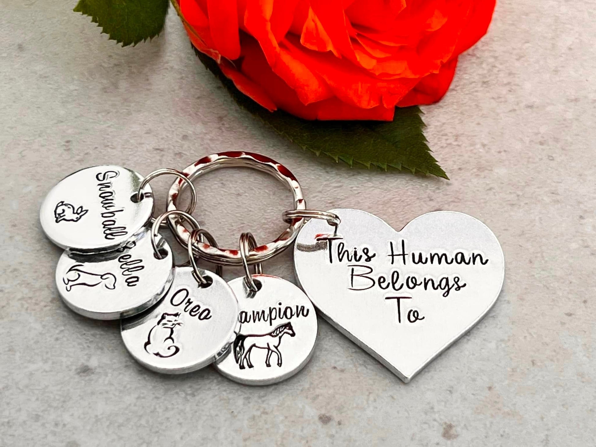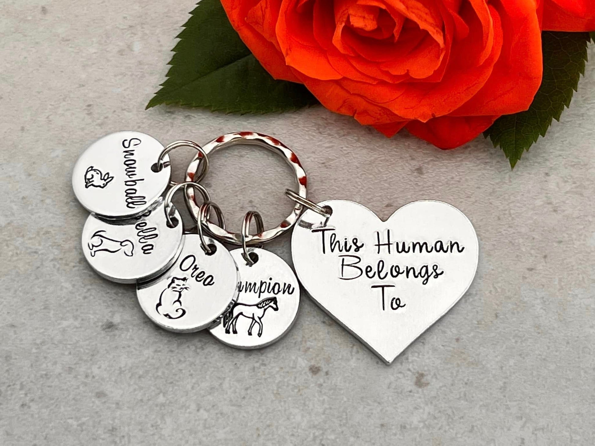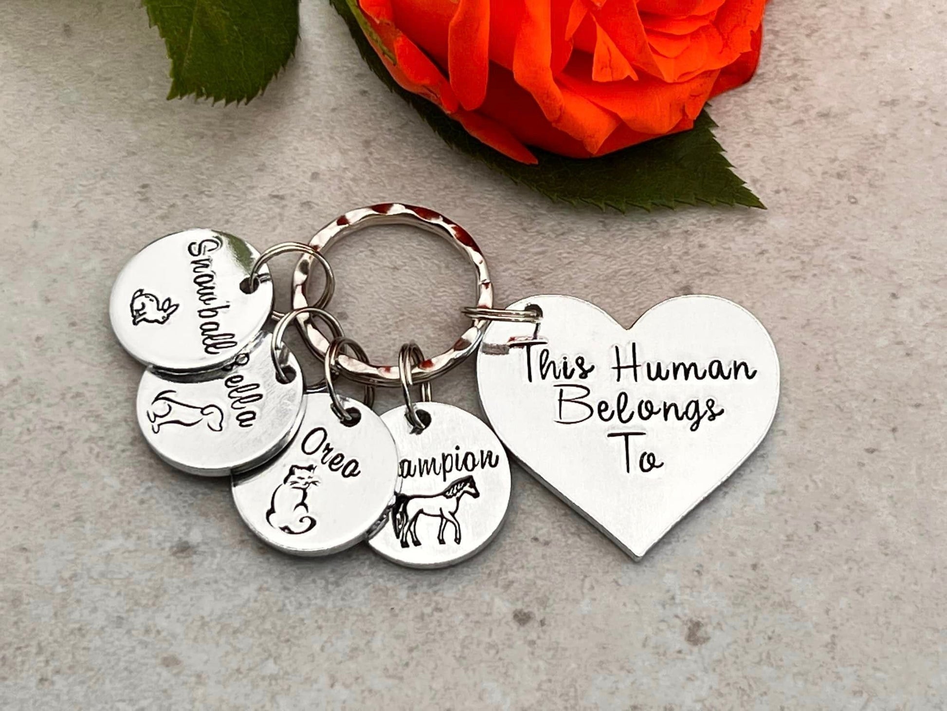 'This human belongs to' hand stamped personalised keyring makes an ideal pet lover gift.