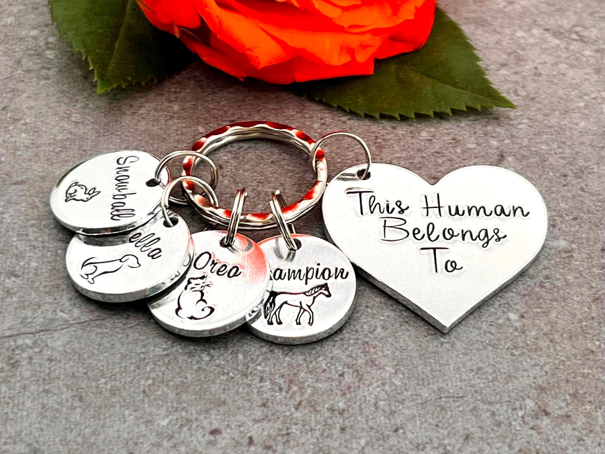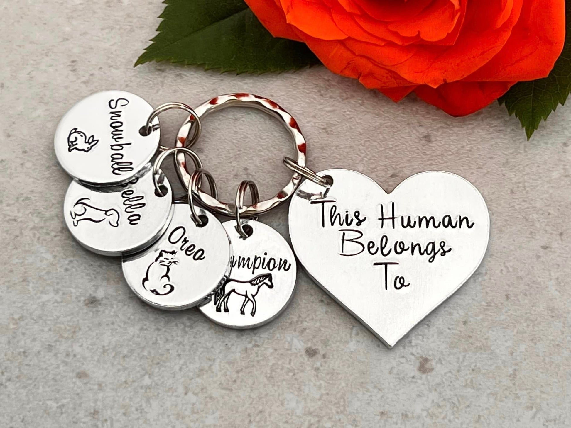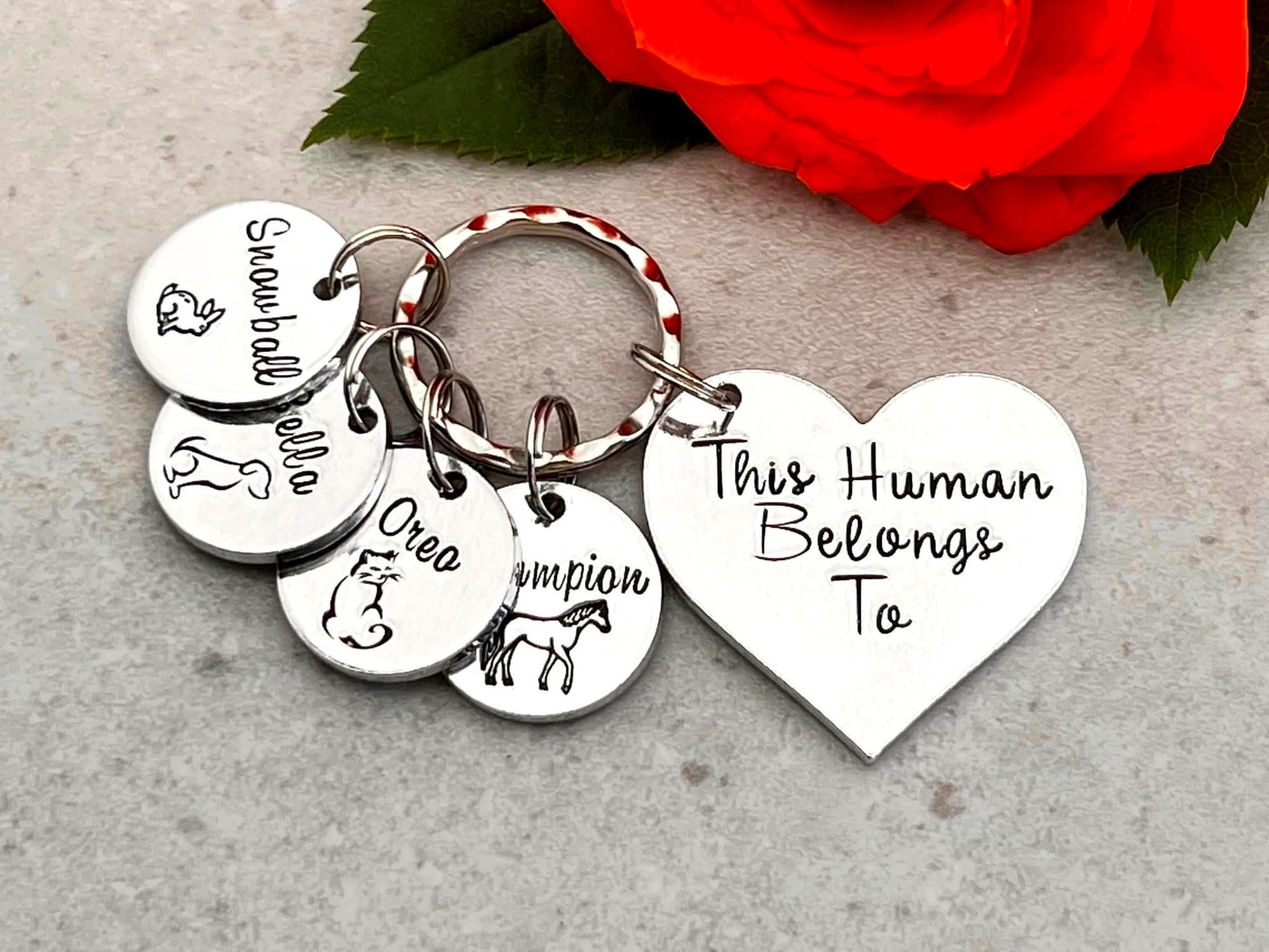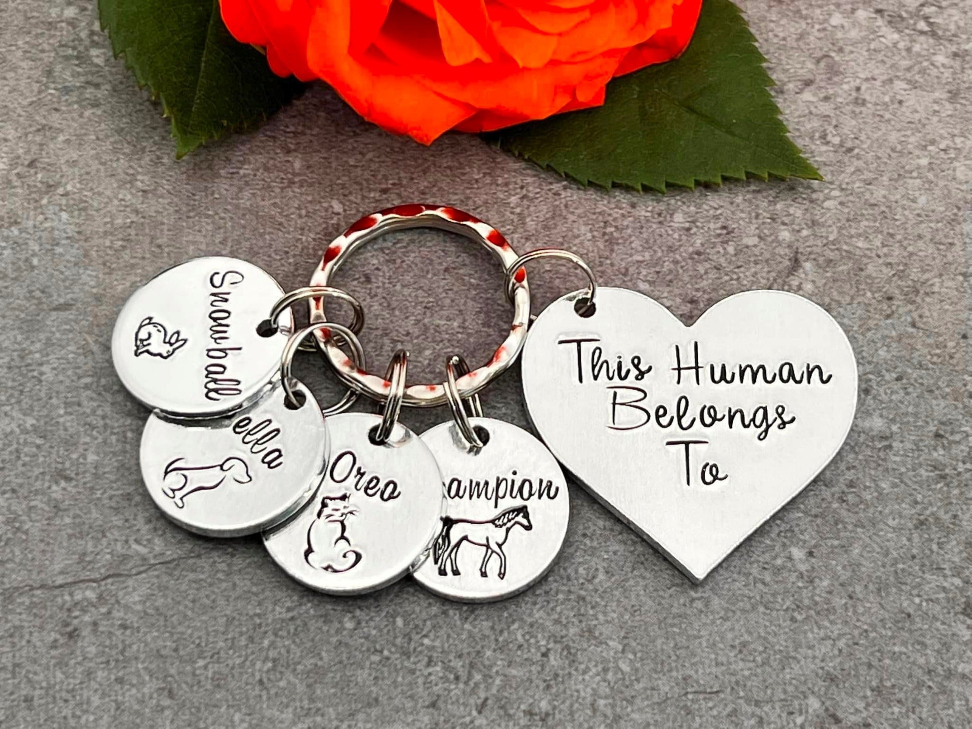 'This human belongs to' hand stamped personalised keyring makes an ideal pet lover gift.