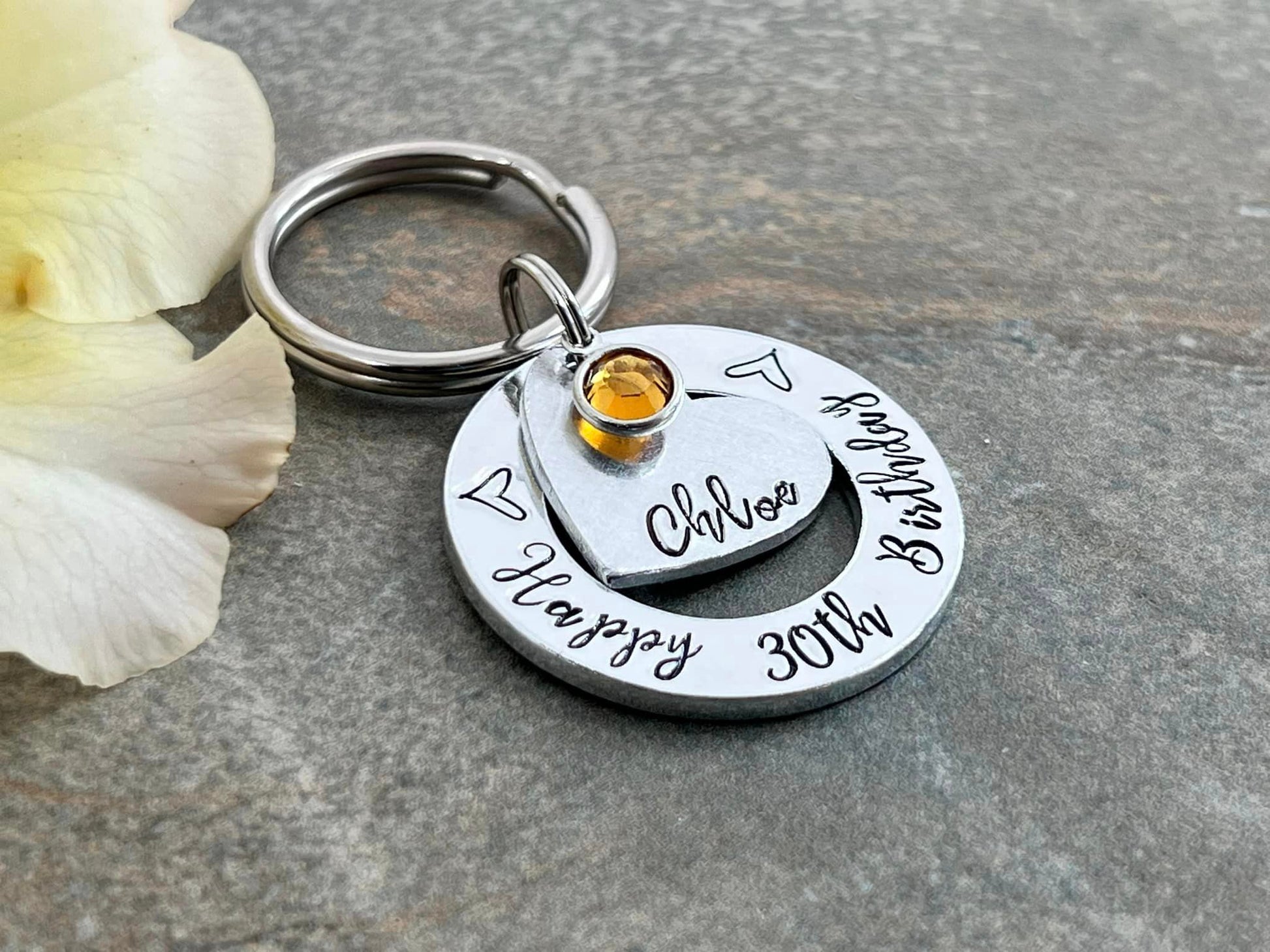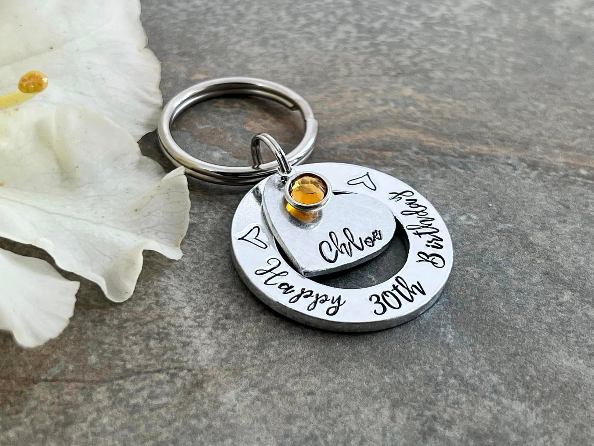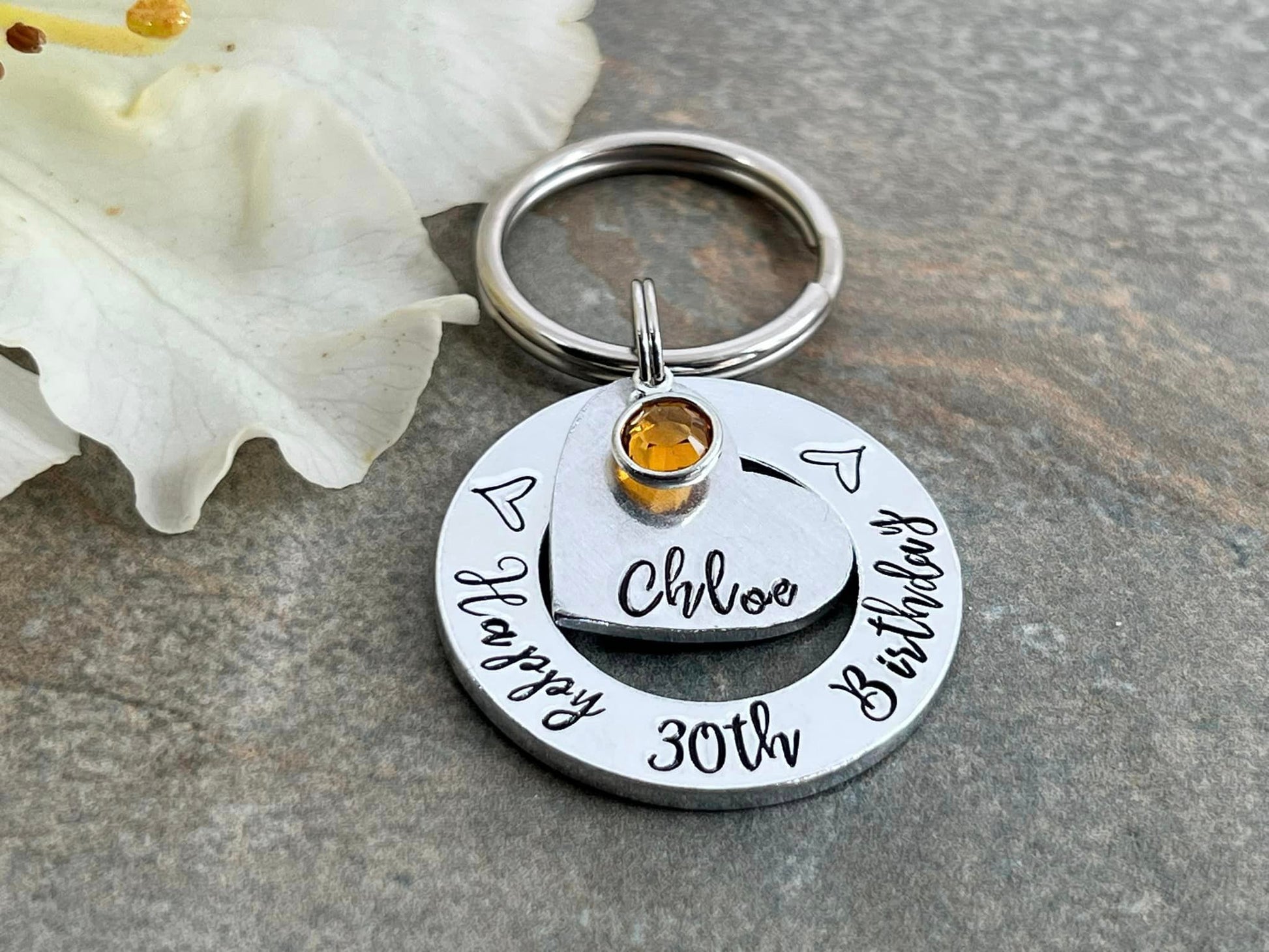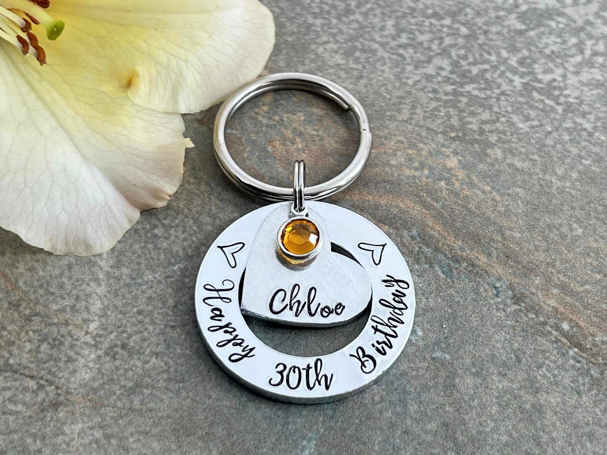 Hand stamped womens Happy 30th/40th/50th/60th Birthday personalised keyring with birthstone. Ideal birthday gift.