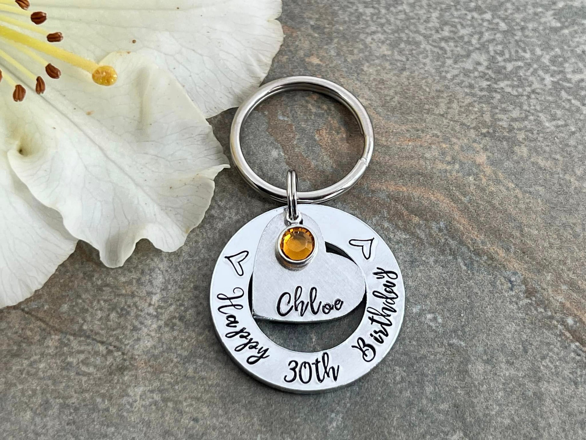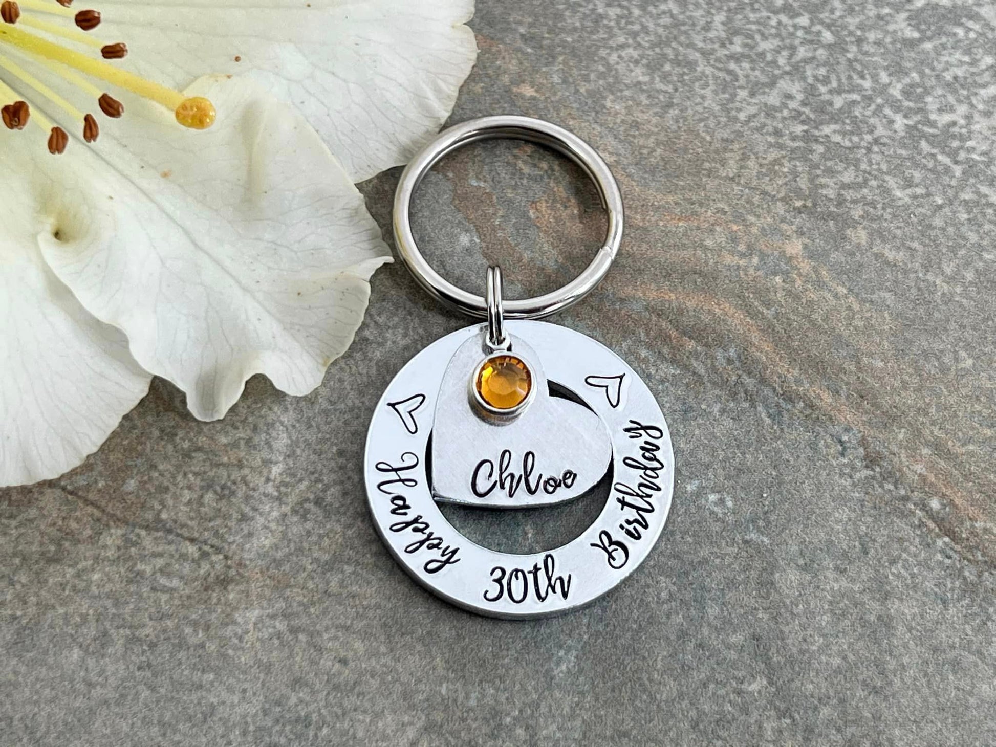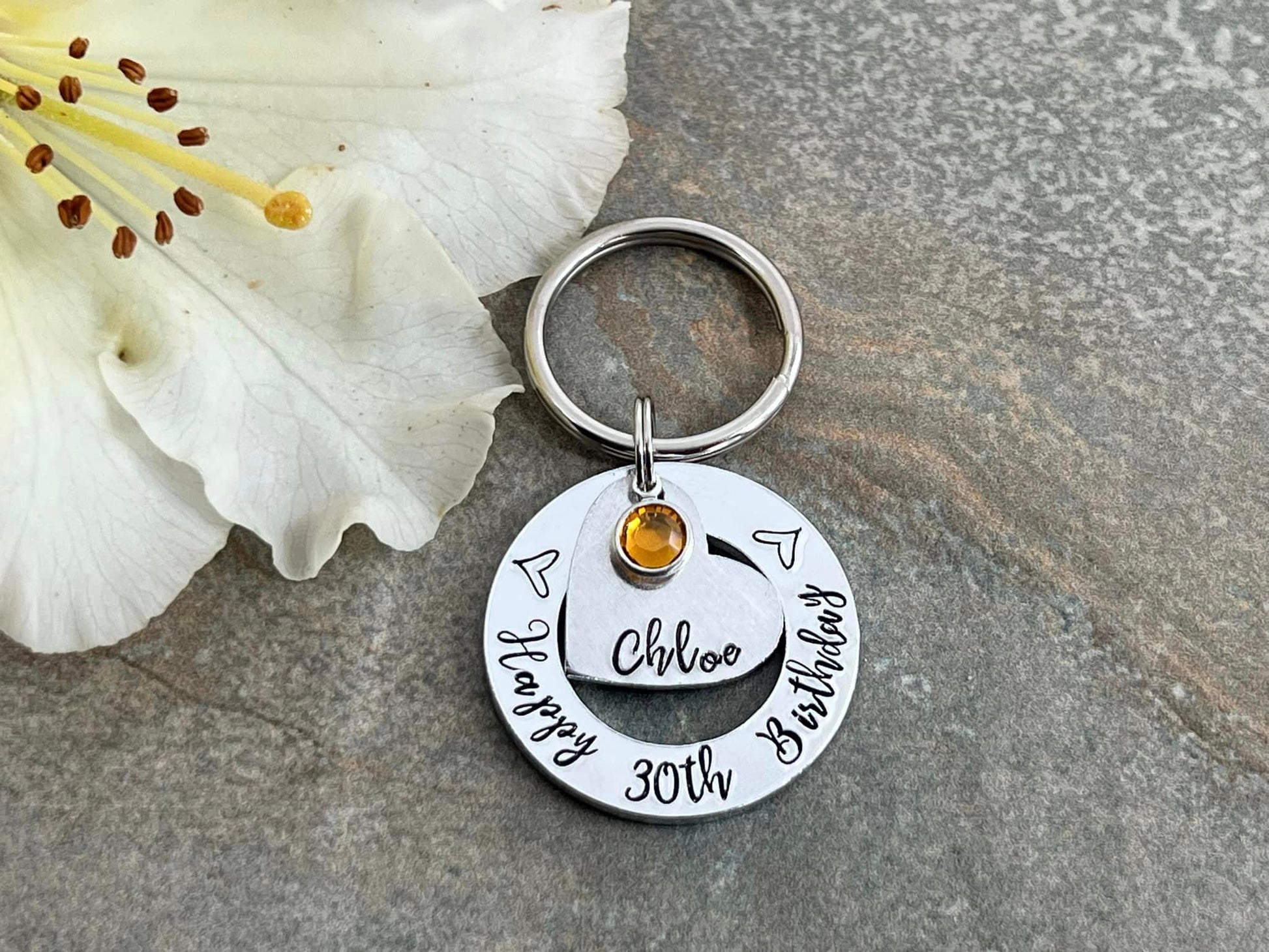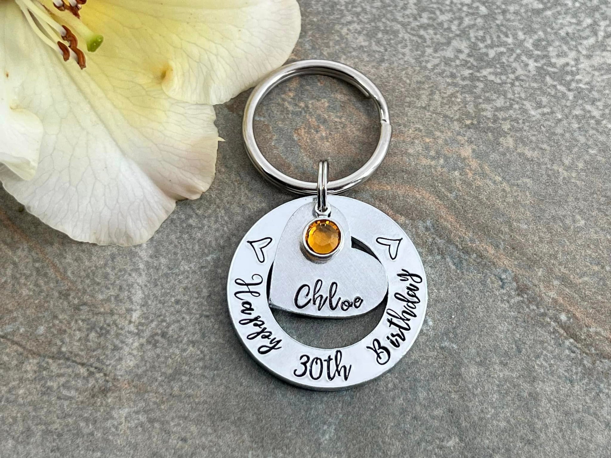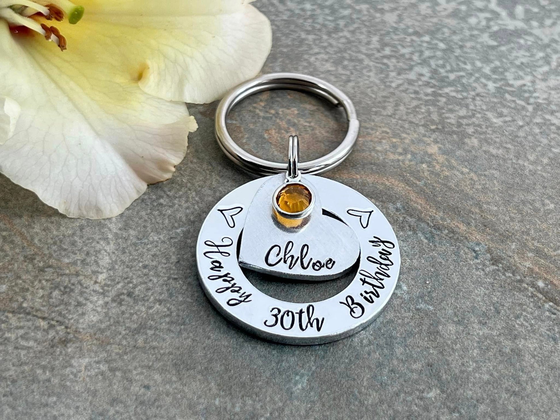 Womens 30th 40th 50th Birthday Gift, 30th Personalised Birthday Keyring with Birthstone