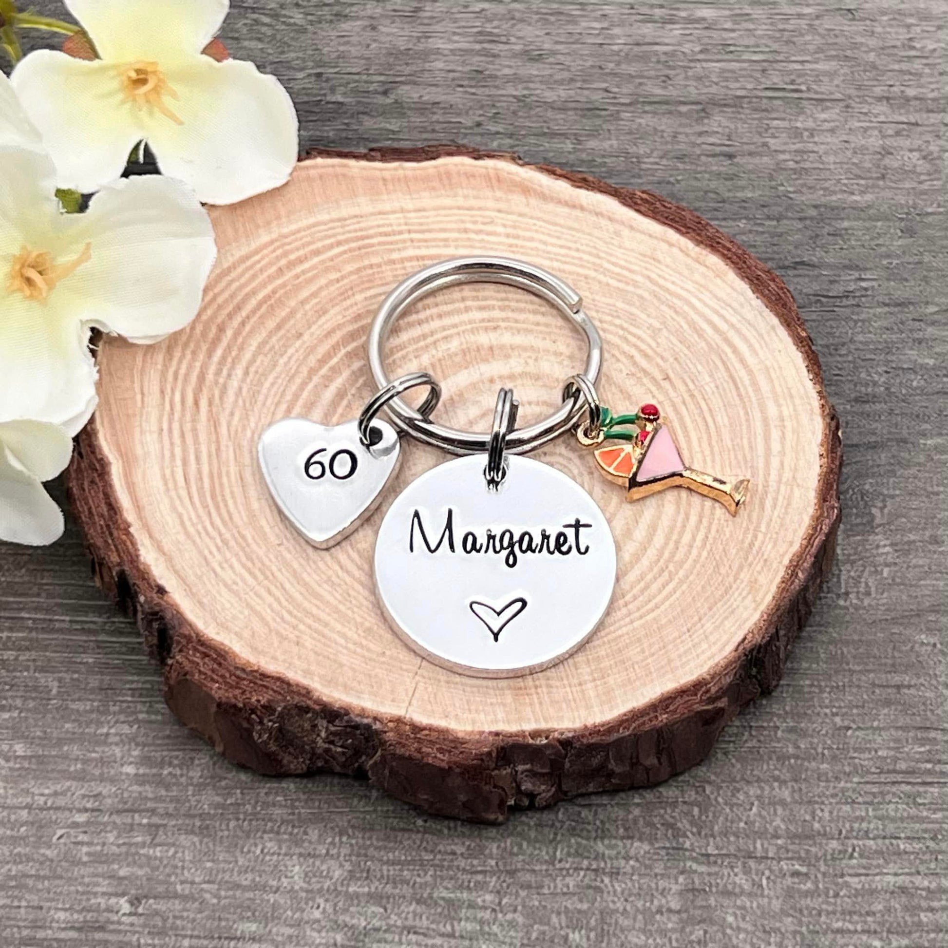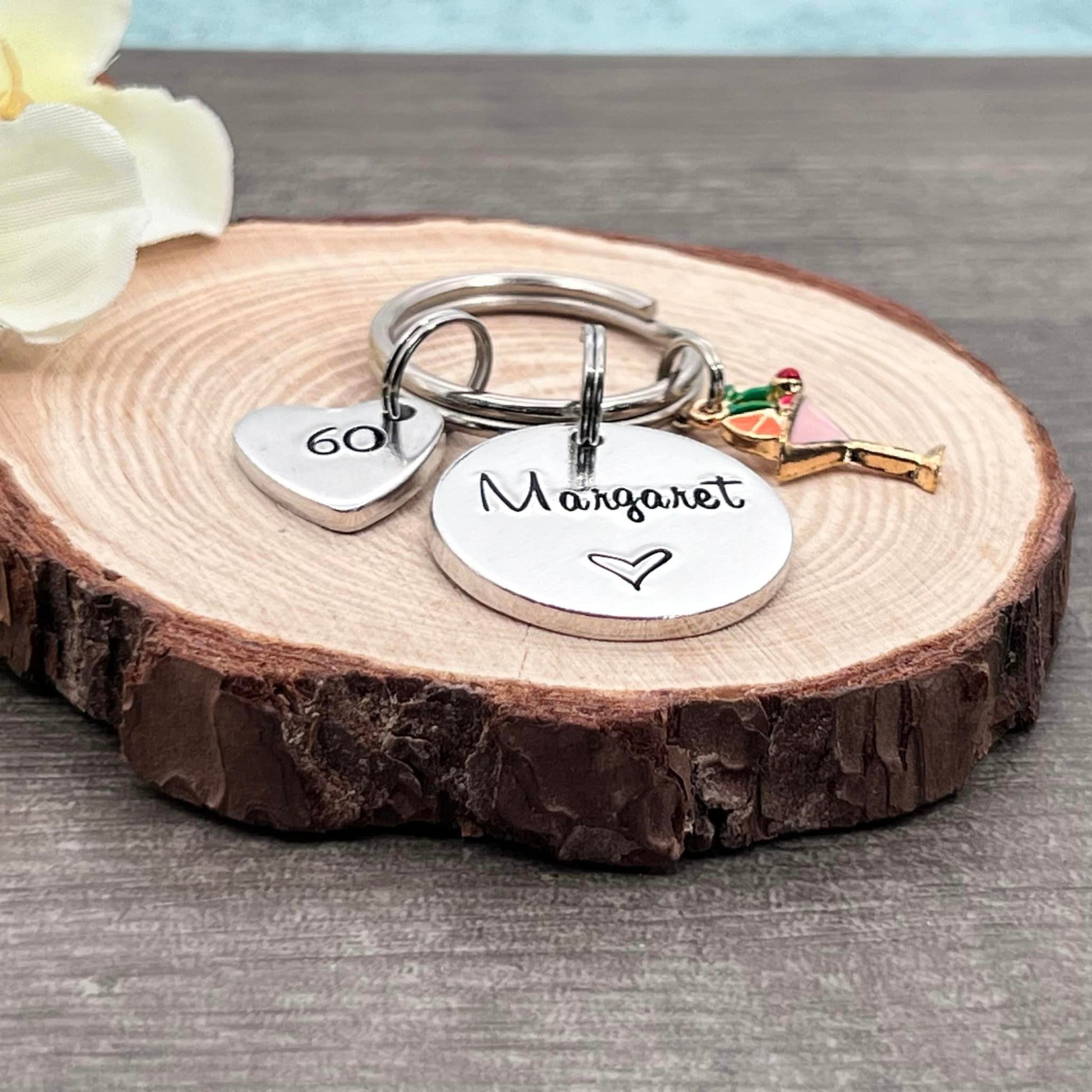Hand stamped 60th birthday personalised keyring. Ideal 60th birthday gift.
